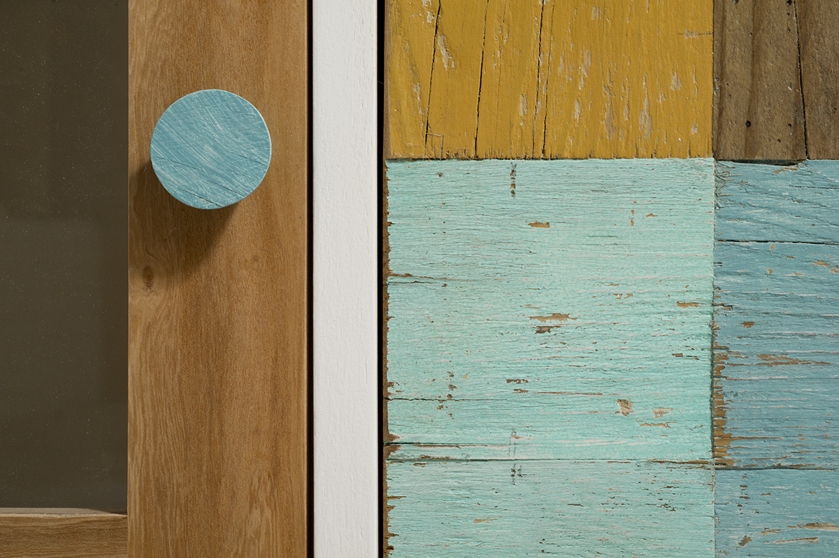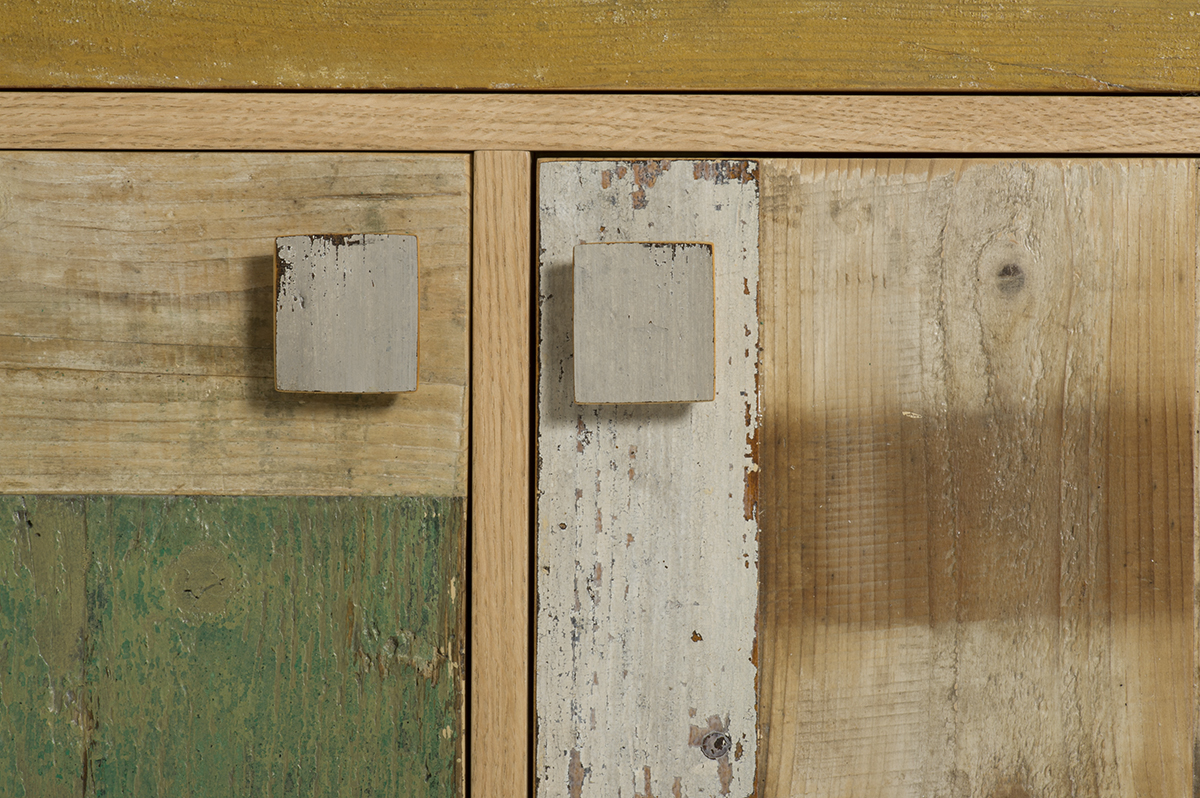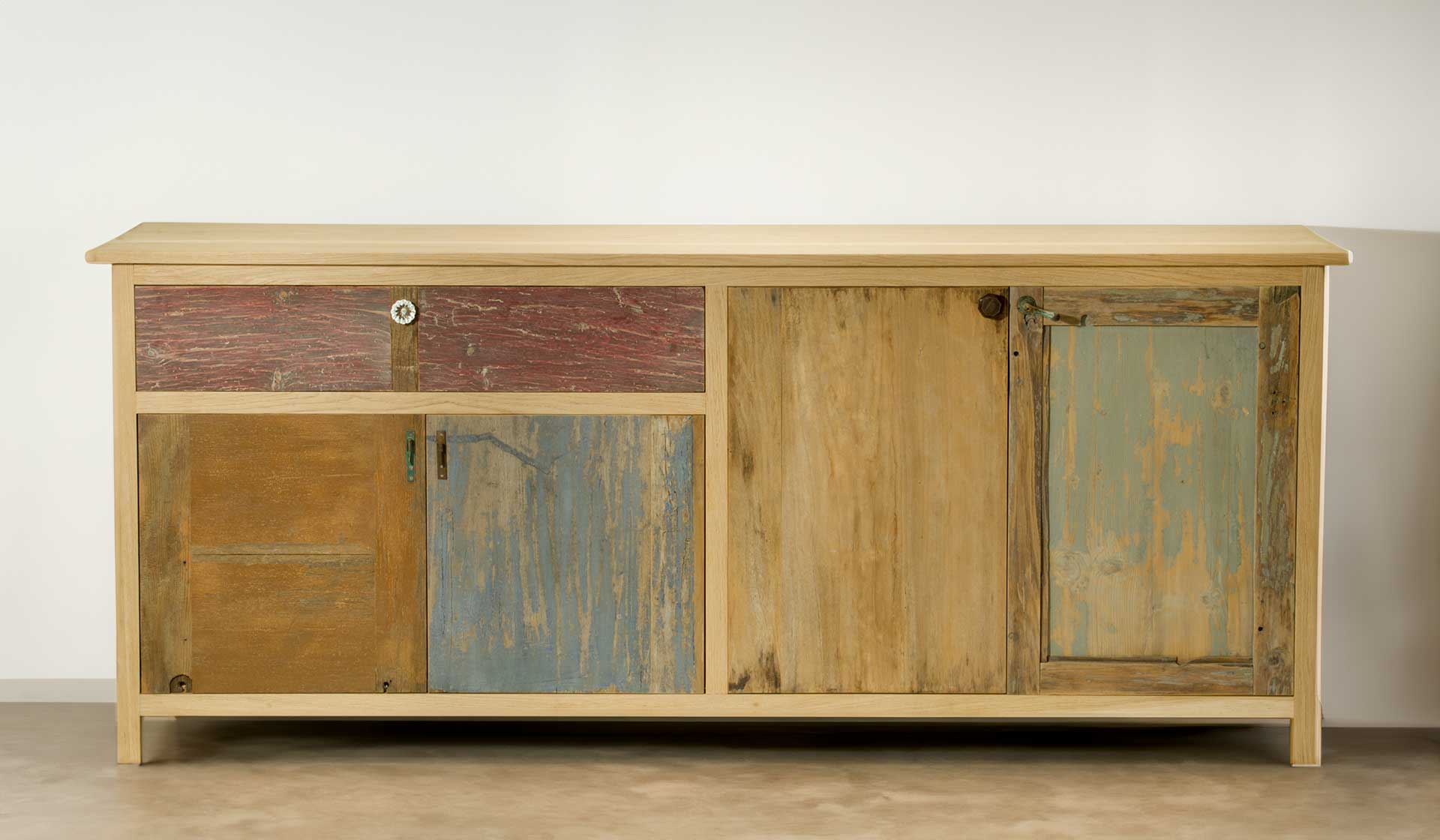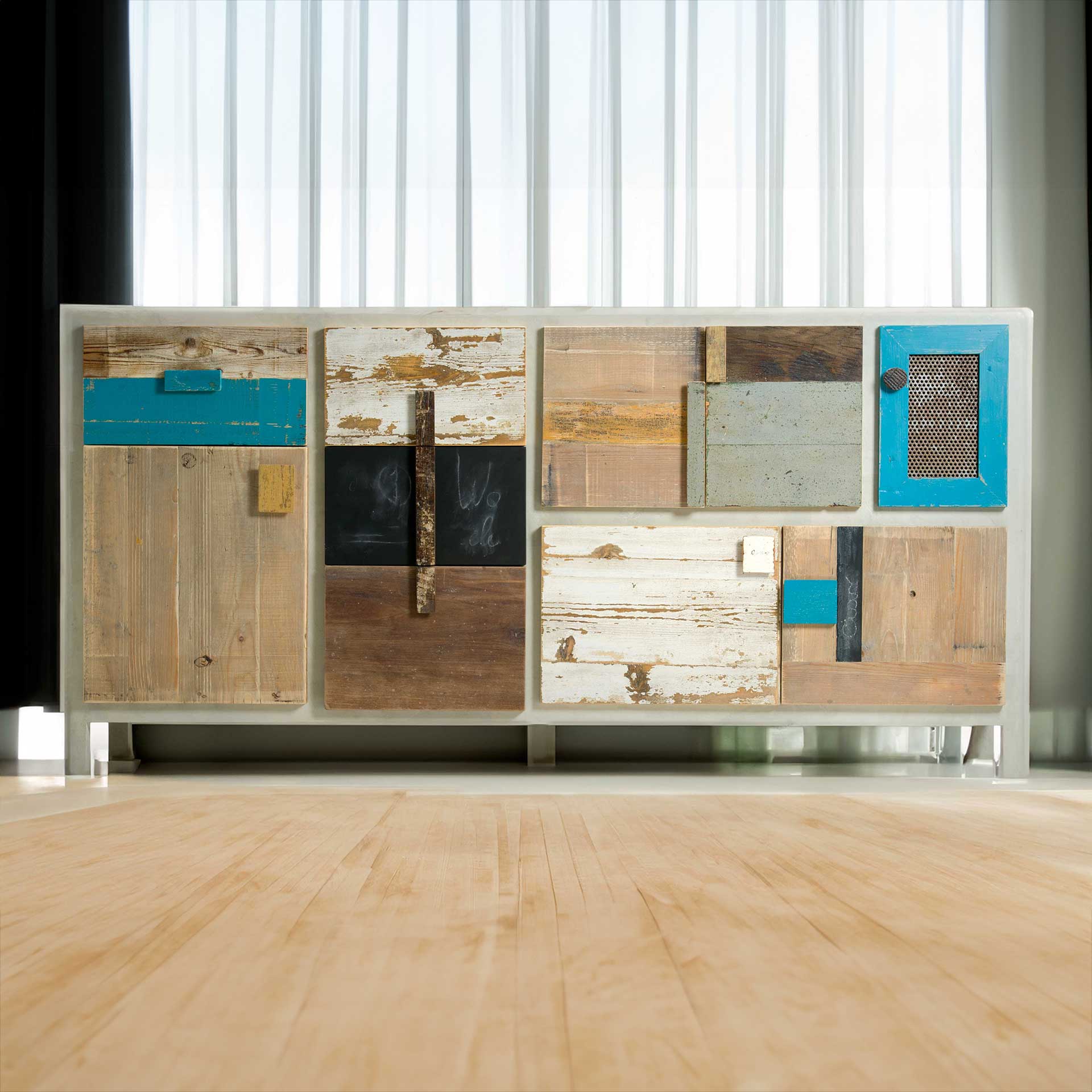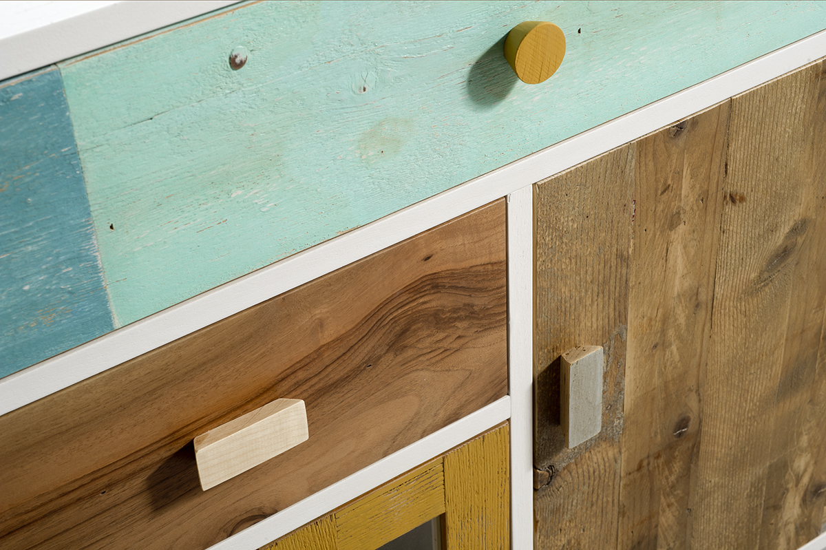 Le nostre credenze in legno di recupero abbracciano tonalità che variano dal caldo dell’ambra al chiaro del rovere, arricchite da inserti di colore.