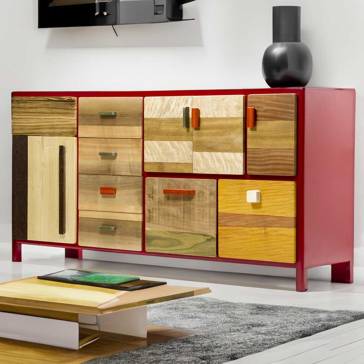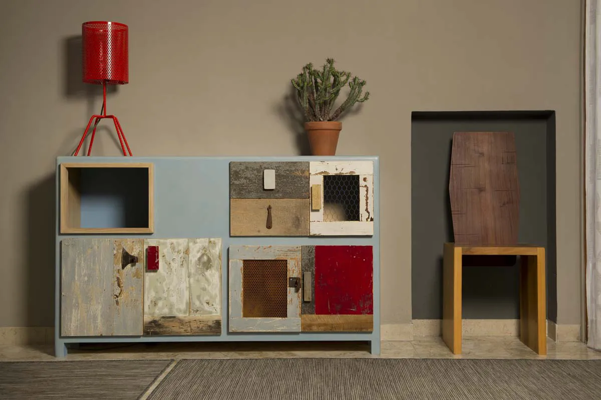 Per un soggiorno bohemian, Laquercia21 propone credenze che esplorano la personalità del legno e la mescolano con accenti audaci.