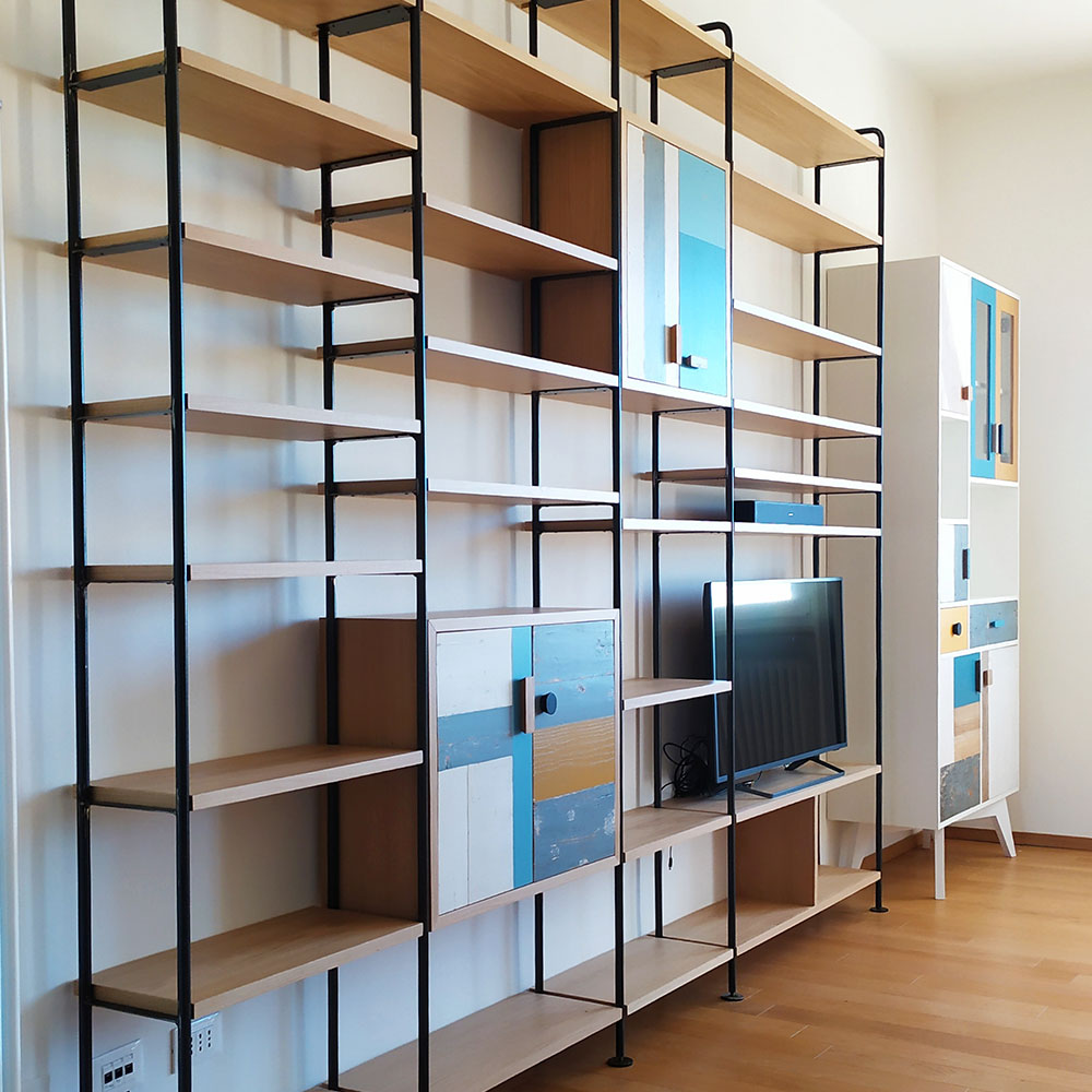• Librerie stile industriale, perfette per ambienti moderni con dettagli in ferro e legno di recupero.