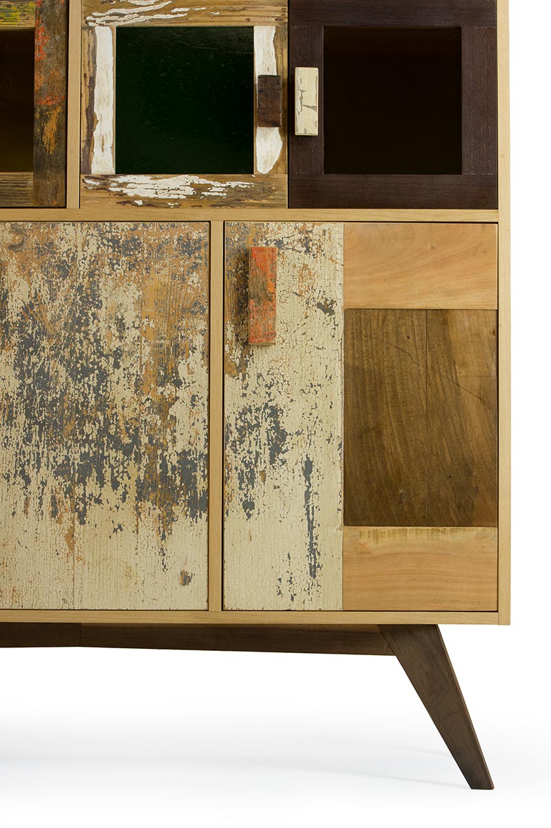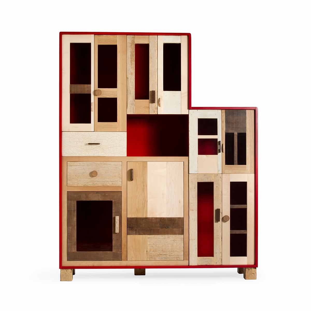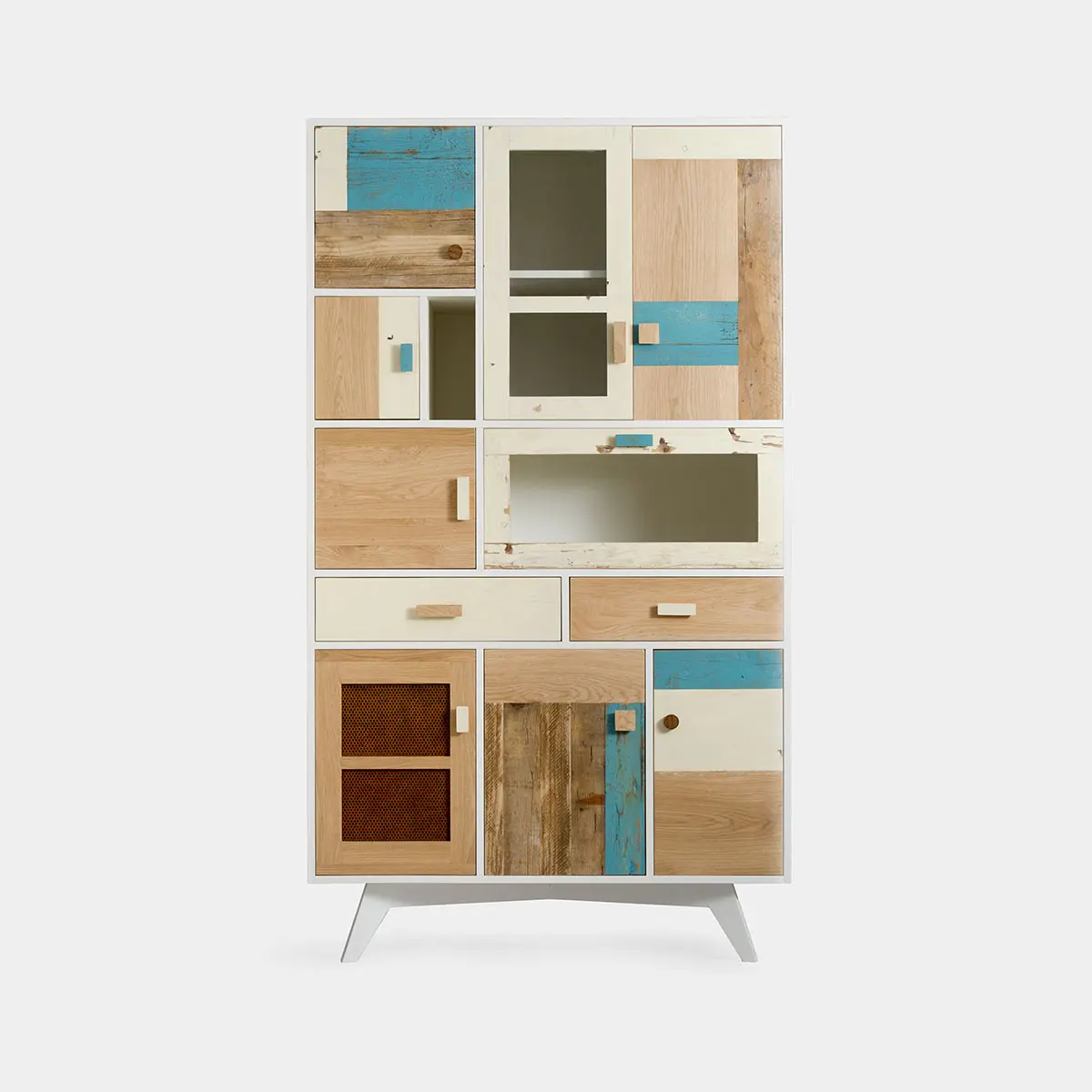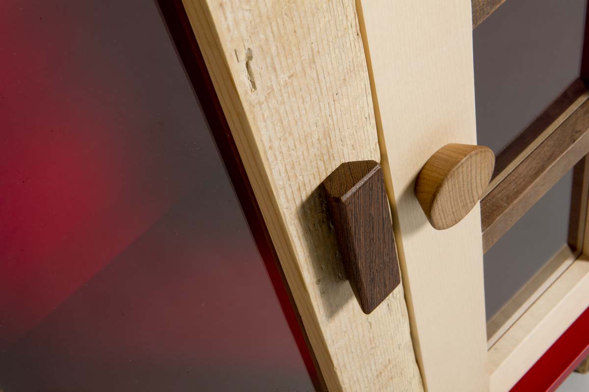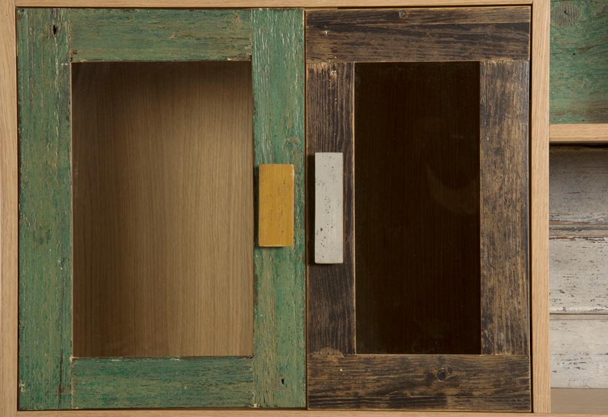 I frontali delle nostre credenze con vetrine sono per noi come un quadro da comporre, utilizzando come tavolozza una vasta gamma di materiali: dal legno massello di varie essenze a quello di recupero o colorato, dal vetro alla lamiera forata di ferro per le ante a telaio, passando per stoffe, metalli, resine e altri materiali non convenzionali.