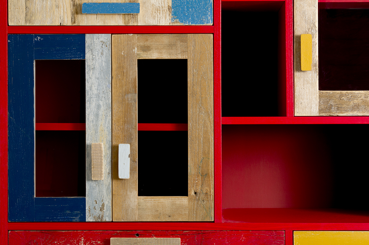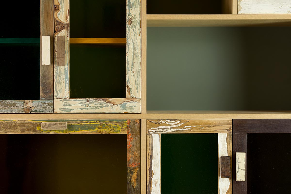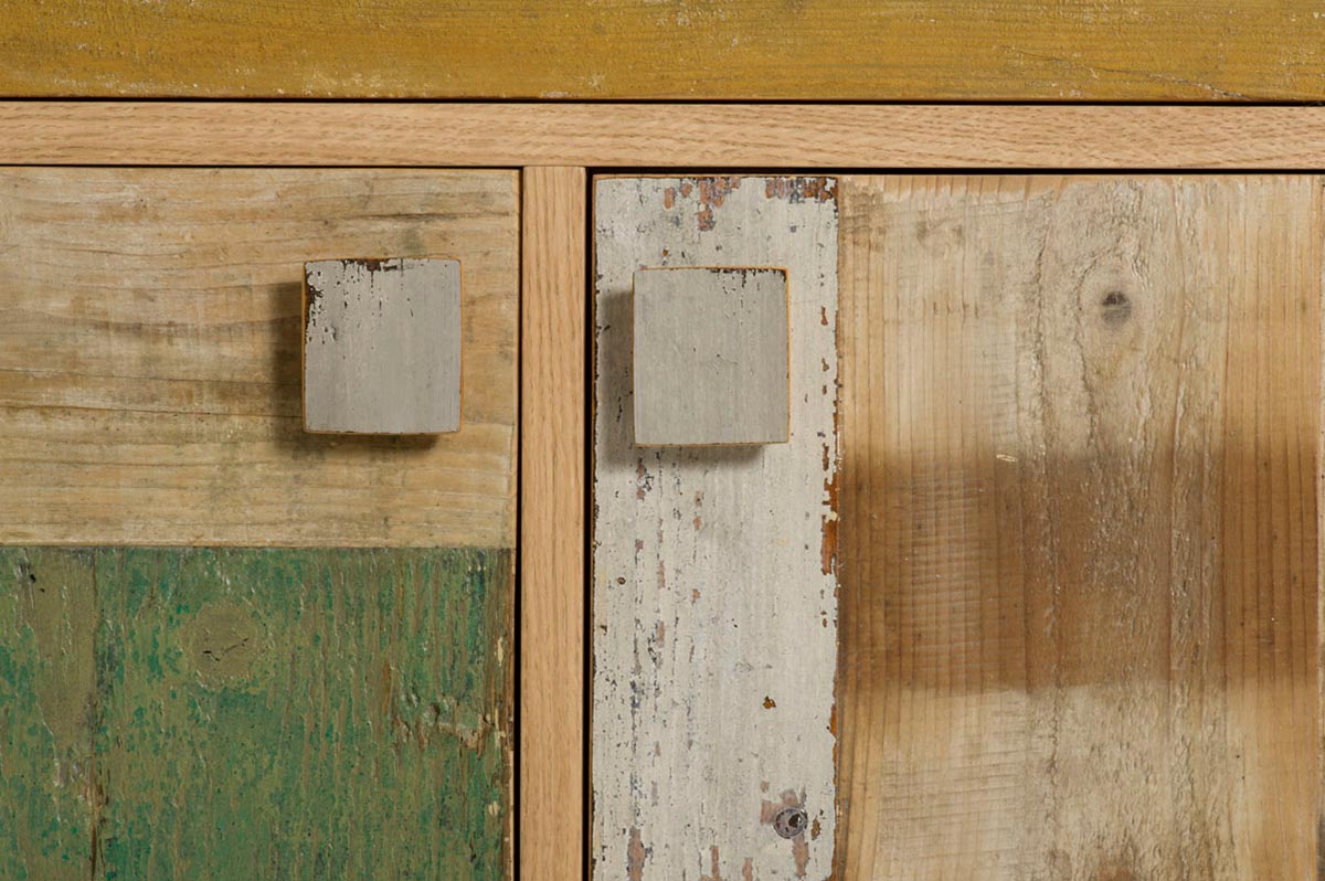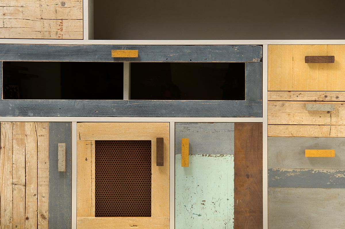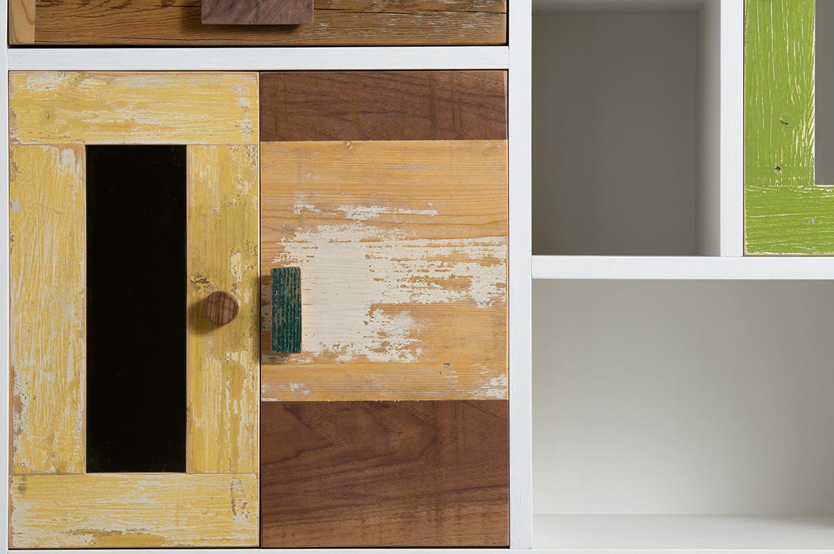 I frontali delle nostre credenze con vetrine sono per noi come un quadro da comporre, utilizzando come tavolozza una vasta gamma di materiali: dal legno massello di varie essenze a quello di recupero o colorato, dal vetro alla lamiera forata di ferro per le ante a telaio, passando per stoffe, metalli, resine e altri materiali non convenzionali.