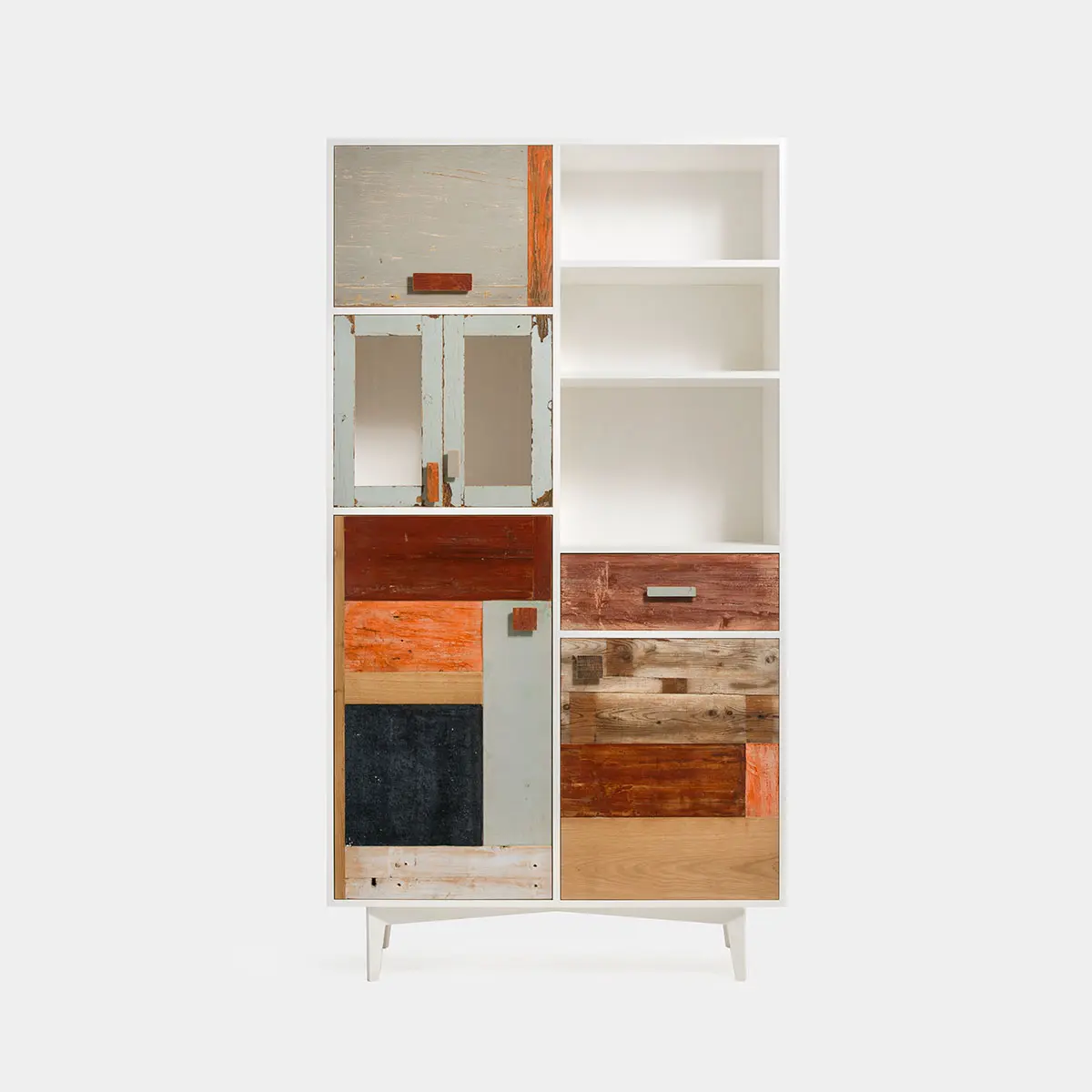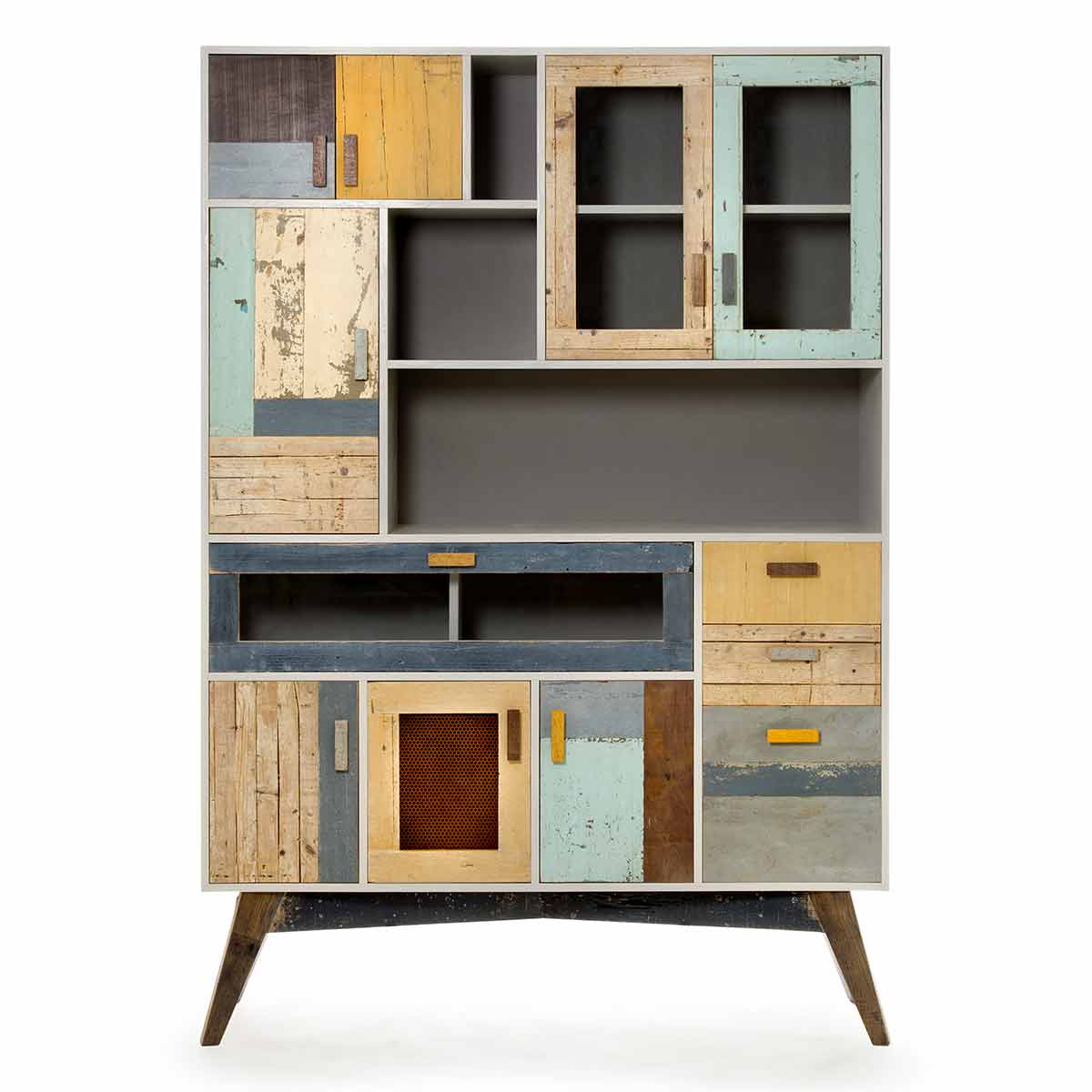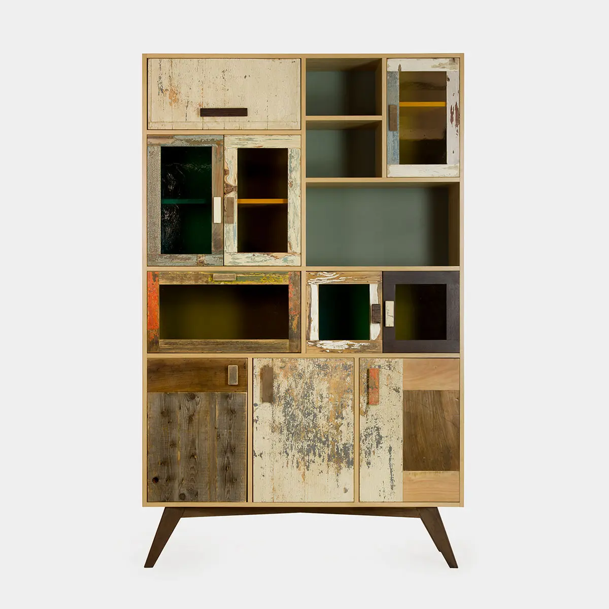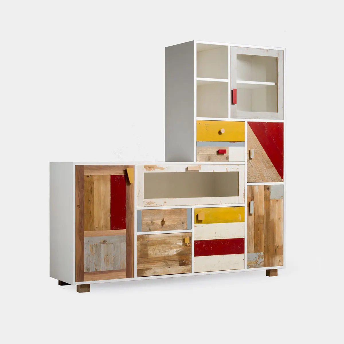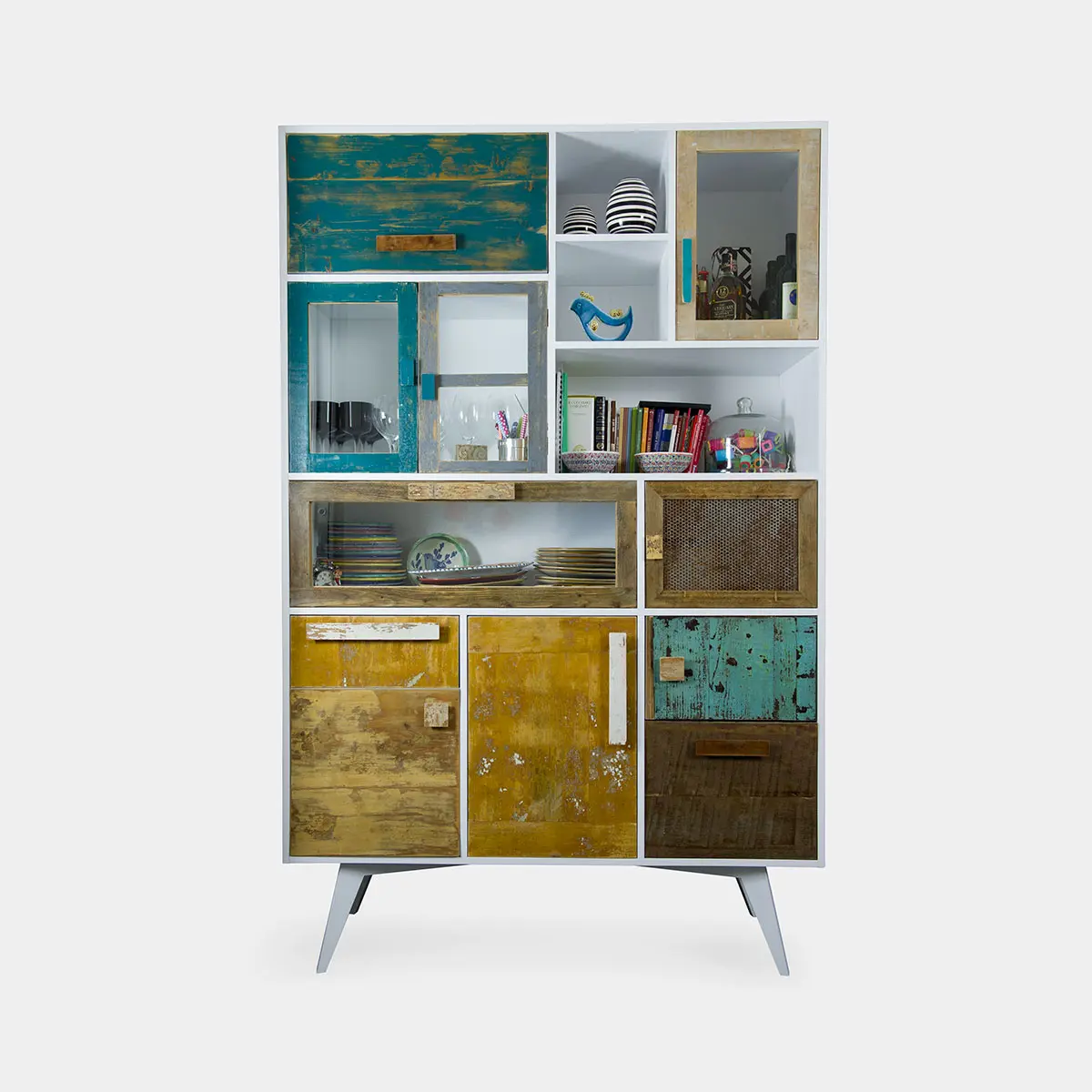 I frontali delle nostre credenze con vetrine sono per noi come un quadro da comporre, utilizzando come tavolozza una vasta gamma di materiali: dal legno massello di varie essenze a quello di recupero o colorato, dal vetro alla lamiera forata di ferro per le ante a telaio, passando per stoffe, metalli, resine e altri materiali non convenzionali.