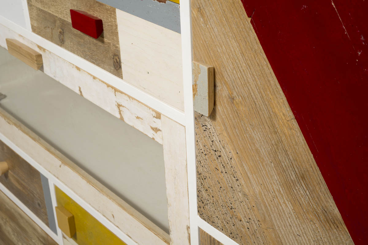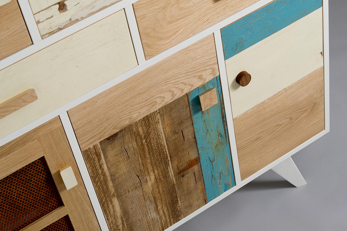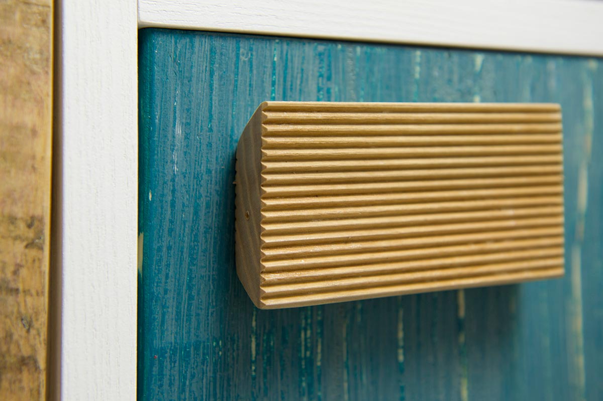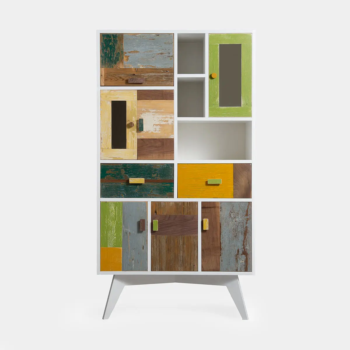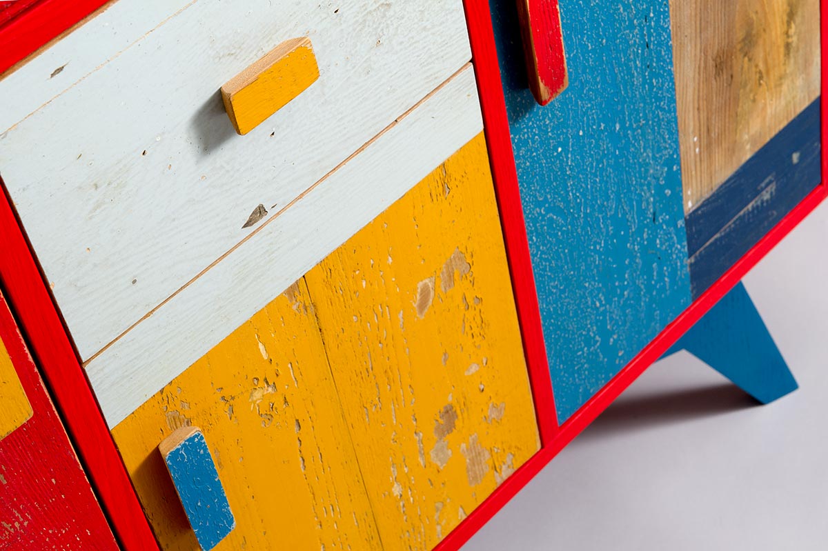 I frontali delle nostre credenze con vetrine sono per noi come un quadro da comporre, utilizzando come tavolozza una vasta gamma di materiali: dal legno massello di varie essenze a quello di recupero o colorato, dal vetro alla lamiera forata di ferro per le ante a telaio, passando per stoffe, metalli, resine e altri materiali non convenzionali.