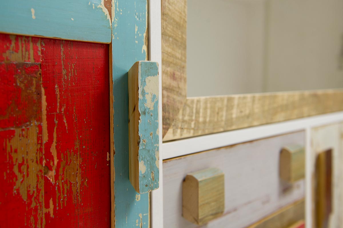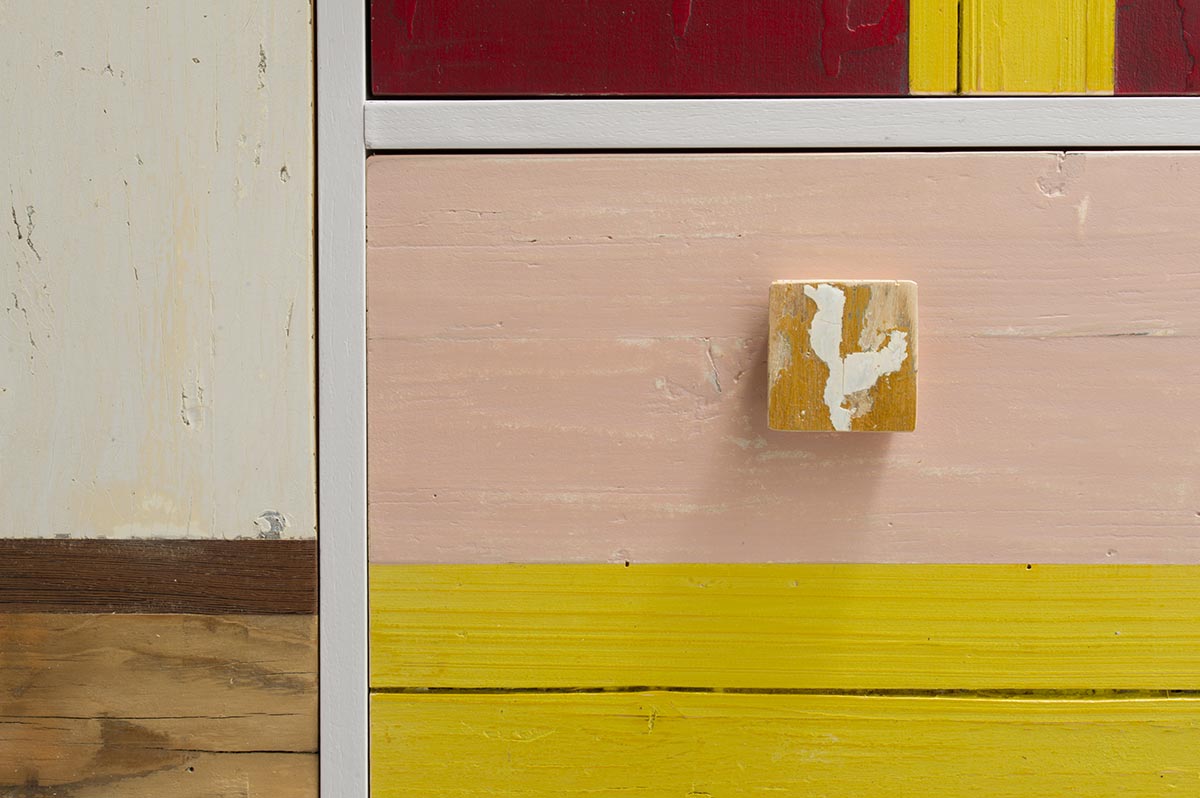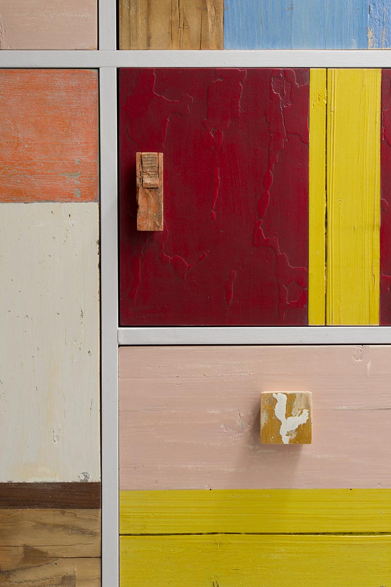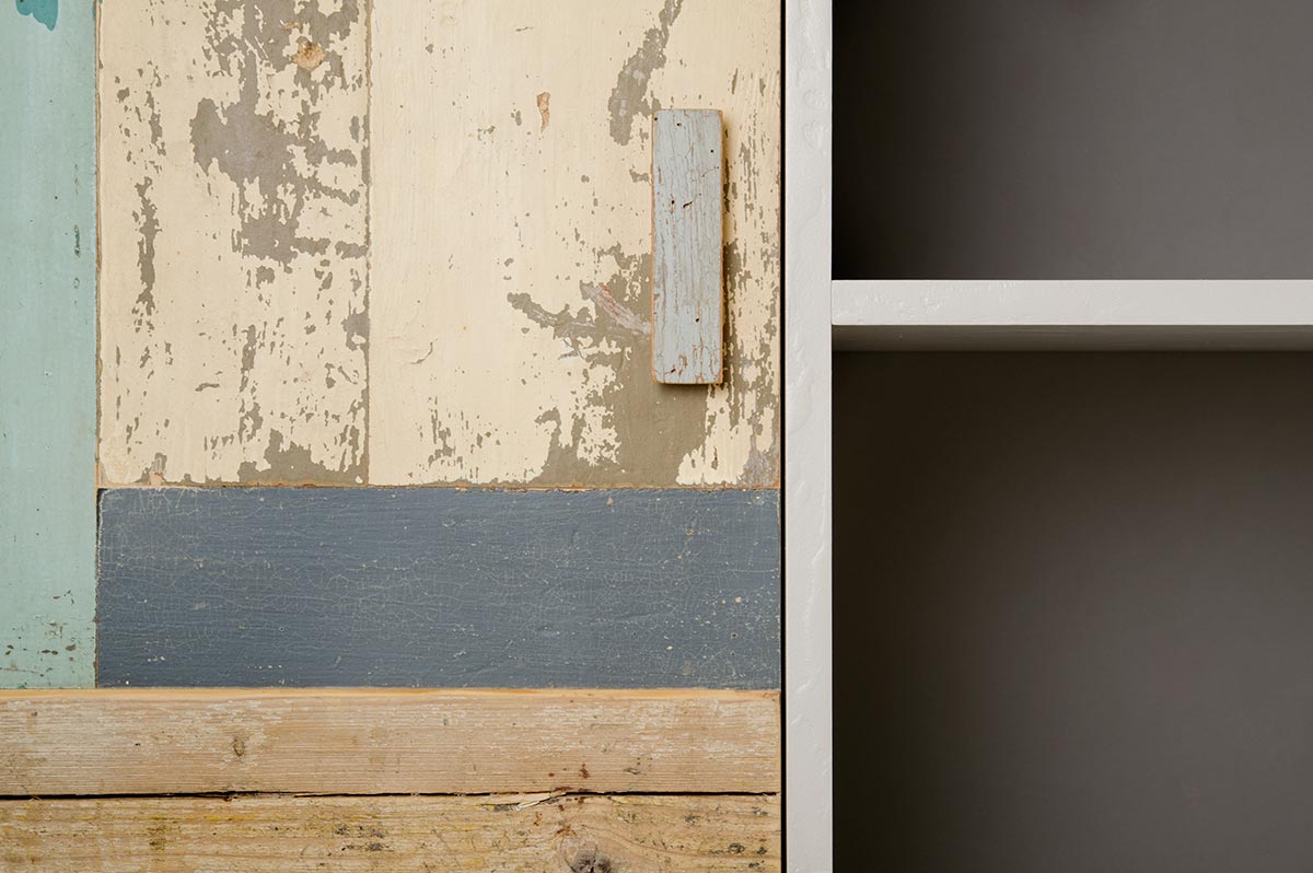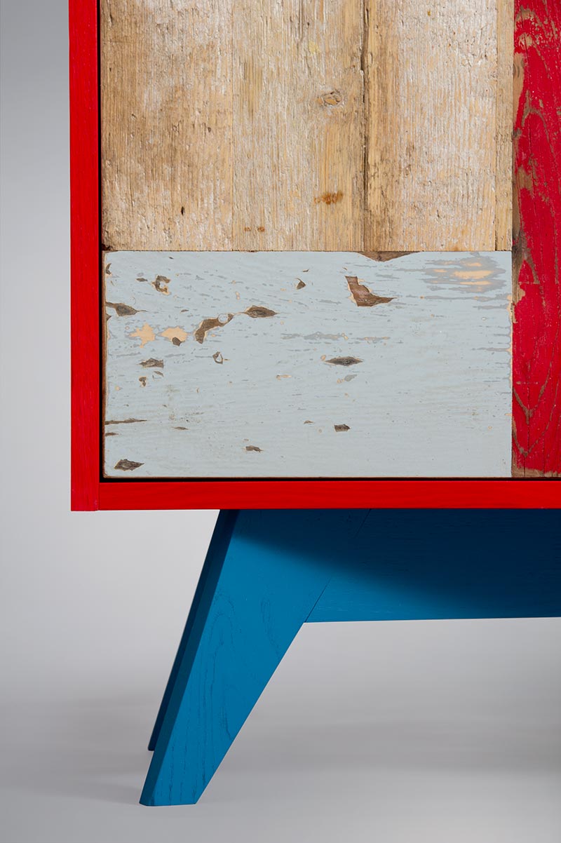 I frontali delle nostre credenze con vetrine sono per noi come un quadro da comporre, utilizzando come tavolozza una vasta gamma di materiali: dal legno massello di varie essenze a quello di recupero o colorato, dal vetro alla lamiera forata di ferro per le ante a telaio, passando per stoffe, metalli, resine e altri materiali non convenzionali.