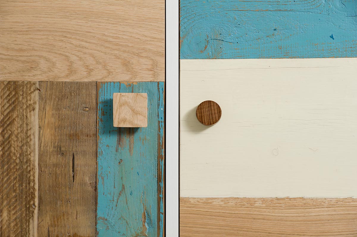 credenze per la cucina in ruvere naturale con sportelli in legno colorato e al naturale