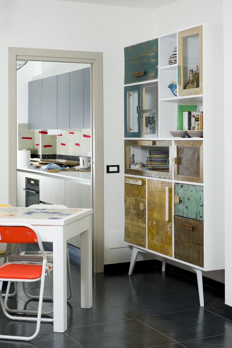A volte gli spazi dove inserire il mobile non sono molto regolari: una finestra, un televisore a muro o altri elementi richiedono di modellare la forma del mobile. La dispensa “ELLE” è nata da una di queste esigenze: la struttura in questo caso segue liberamente  la porzione di spazio che può occupare sviluppandosi asimmetricamente.