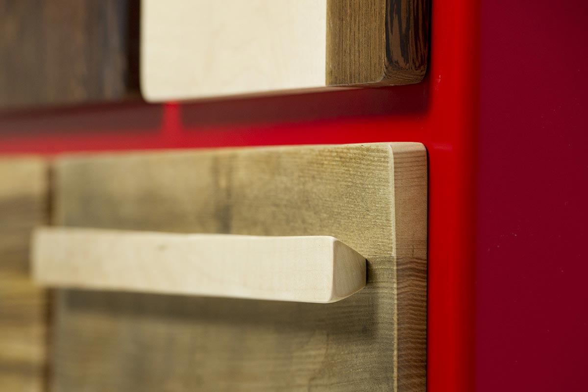 Il legno massello, in combinazione con superfici laccate o rifinite con microcemento colorato, assume tutta un’altra aria: la sua sobria bellezza ed eleganza viene esaltata e arricchita dal contrasto con il colore vivo, creando una commistione “pop” dal gusto molto contemporaneo. La laccatura si può usare anche come elemento di contrasto con il legno di recupero, giocando con elementi in aperta opposizione tra loro: nuovo vs vecchio, freddo vs caldo, liscio vs materico. Ogni mobile è un’invenzione estetica e una ricerca di nuove combinazioni tra colori e materiali