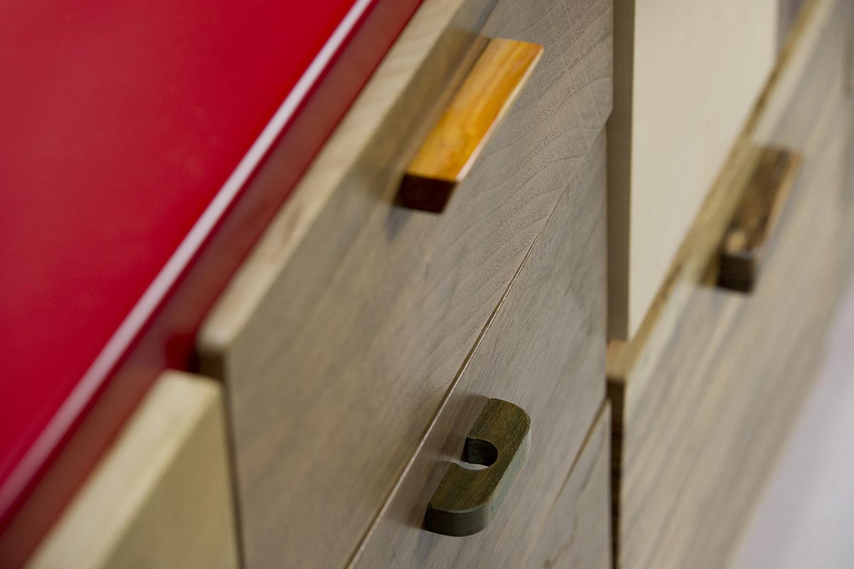 Alcune delle nostre credenze colorate combinano una struttura colorata laccata con sportelli e cassetti in legno massello di varie essenze, mixate tra loro. La superficie naturale e porosa del legno contrasta con quella liscia e brillante della laccatura.