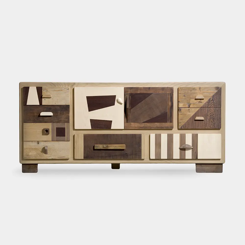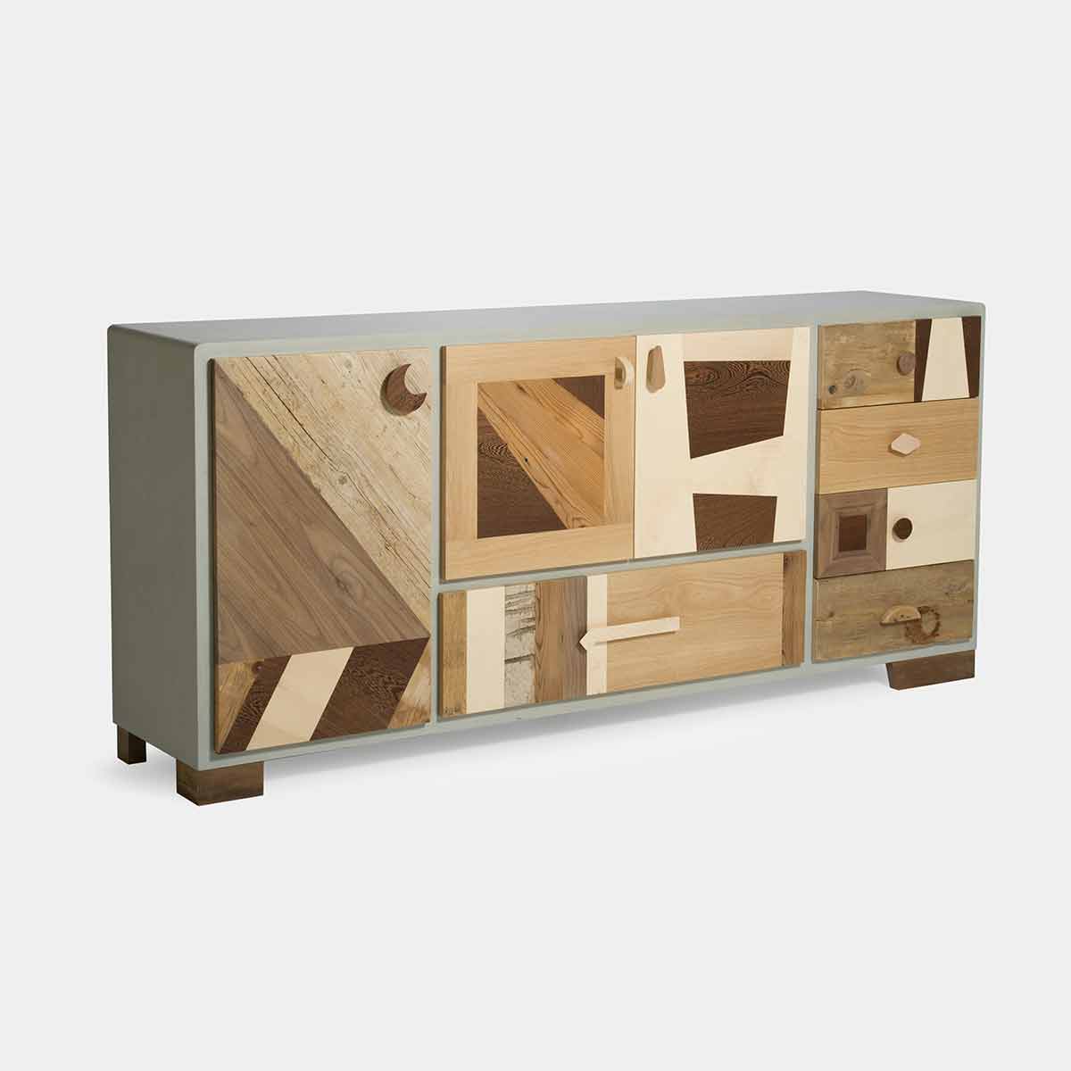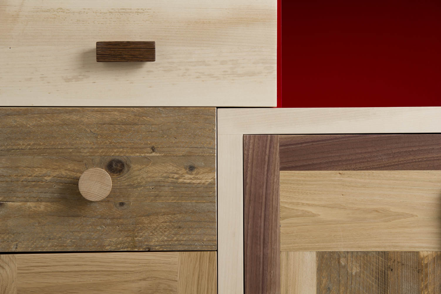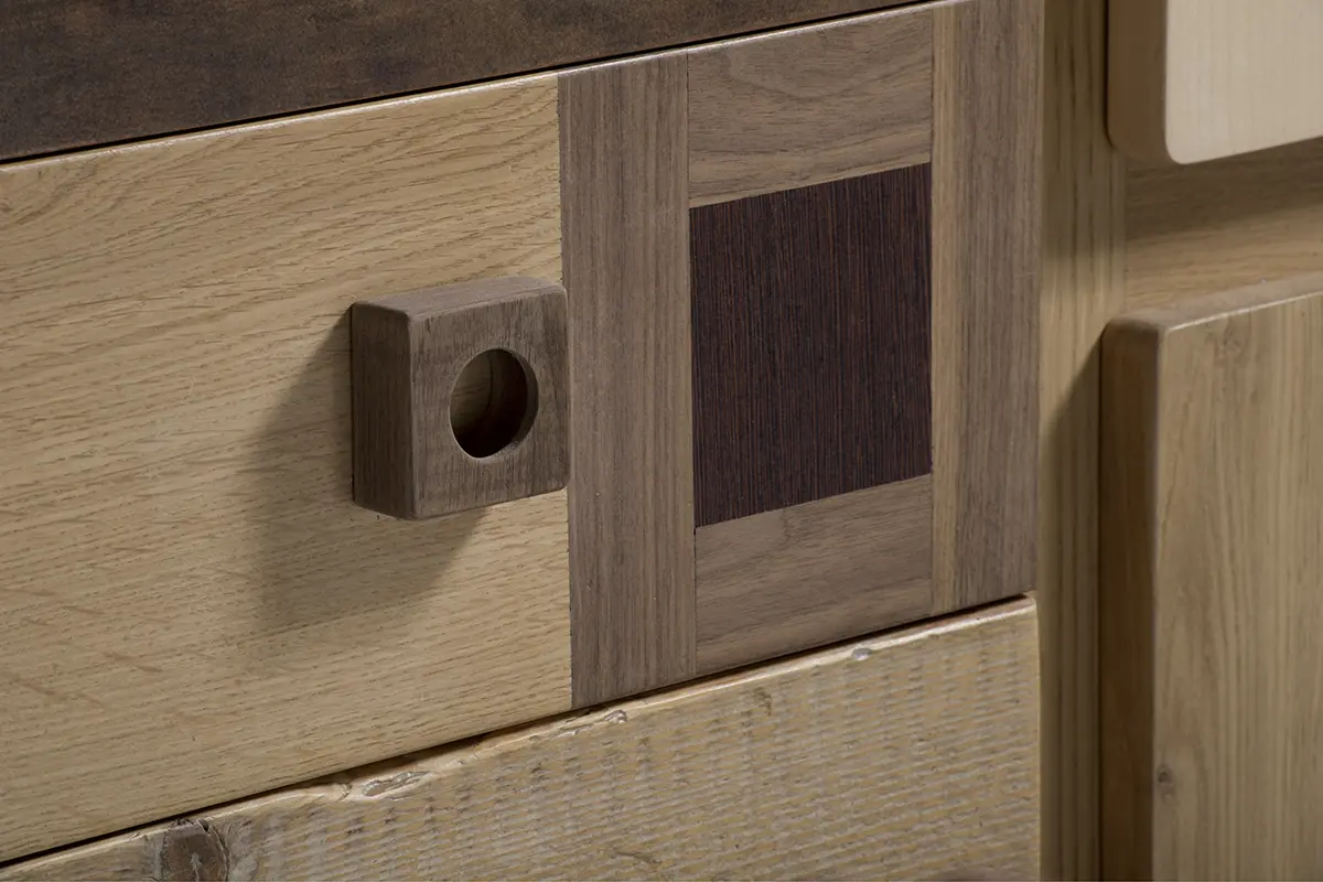 Le nostre credenze in legno “Patchwork” combinano una struttura laccata con sportelli e cassetti in legno massello al naturale in varie essenze, mixate tra loro. La superficie naturale e porosa del legno contrasta con quella liscia e brillante della laccatura.
