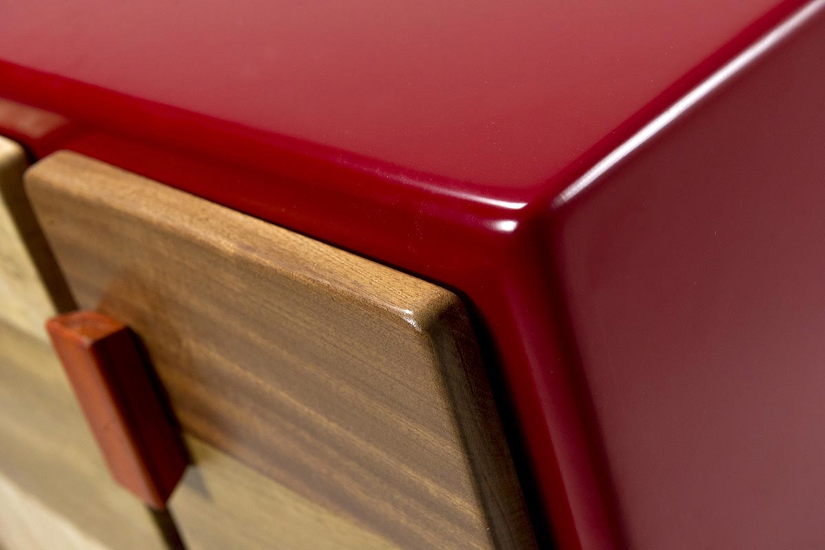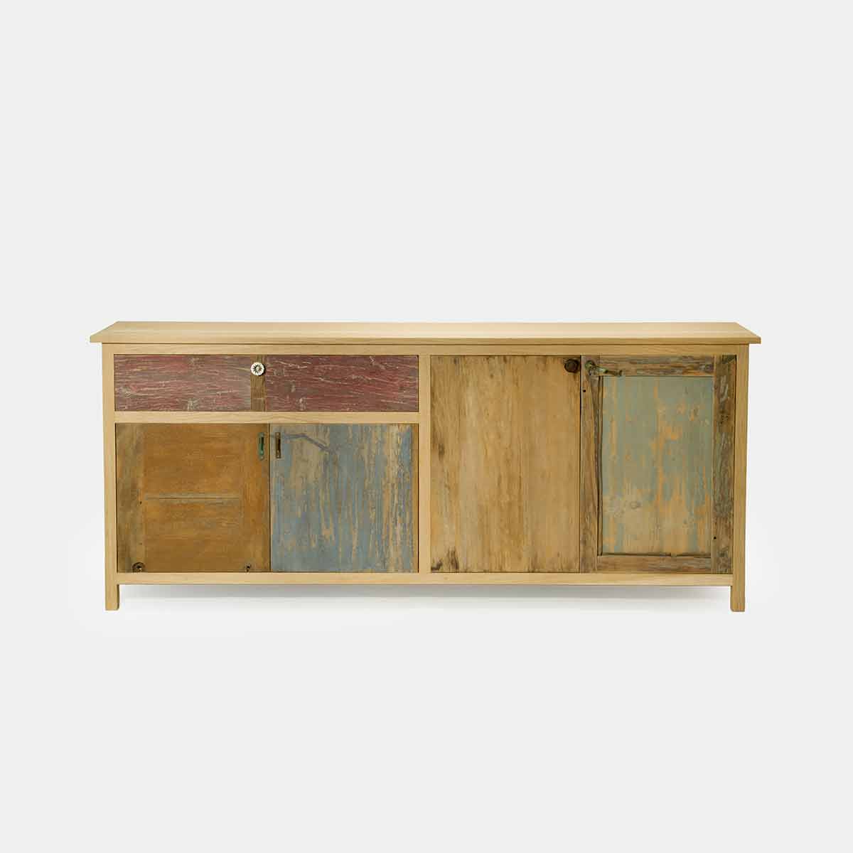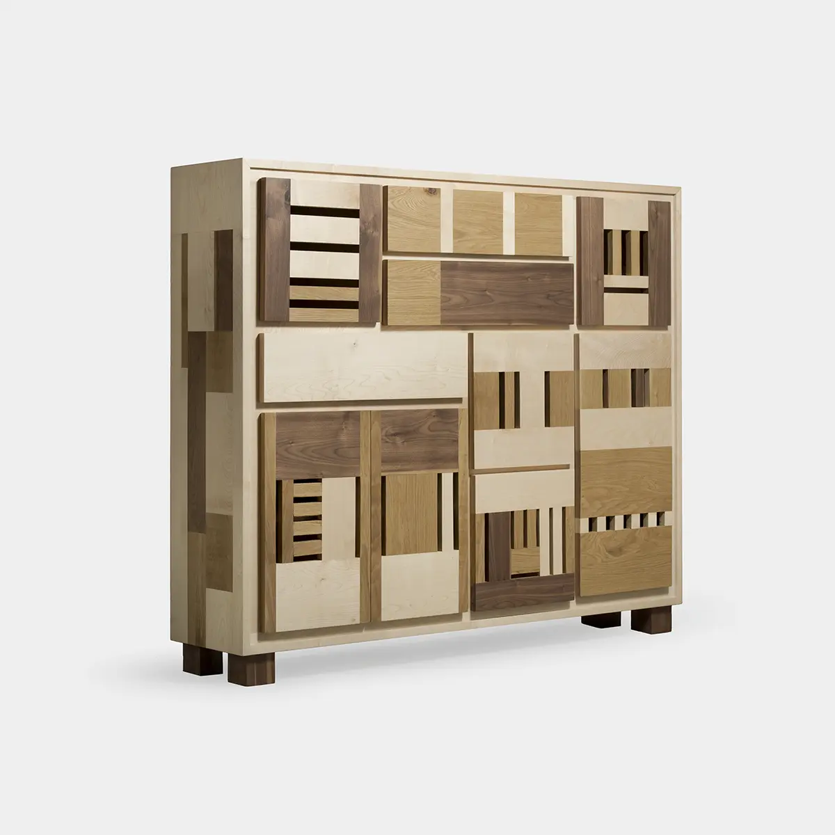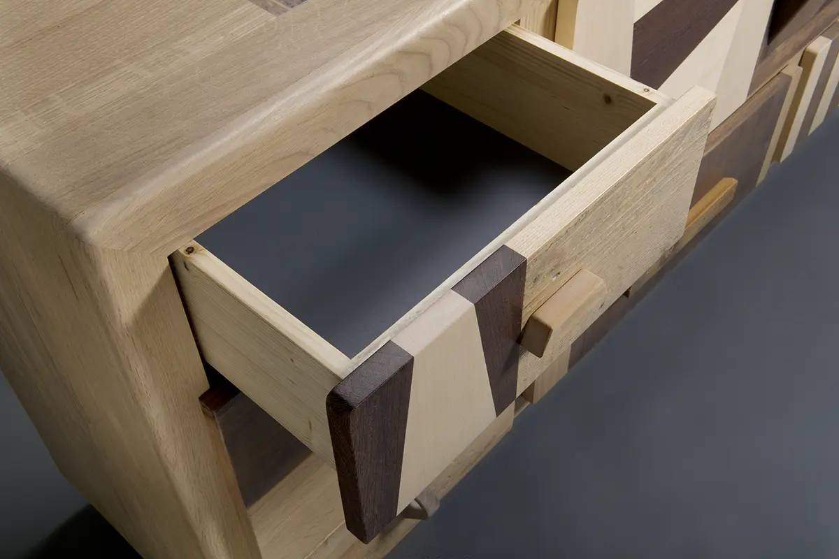 Le nostre credenze in legno “Patchwork” combinano una struttura laccata con sportelli e cassetti in legno massello al naturale in varie essenze, mixate tra loro. La superficie naturale e porosa del legno contrasta con quella liscia e brillante della laccatura.