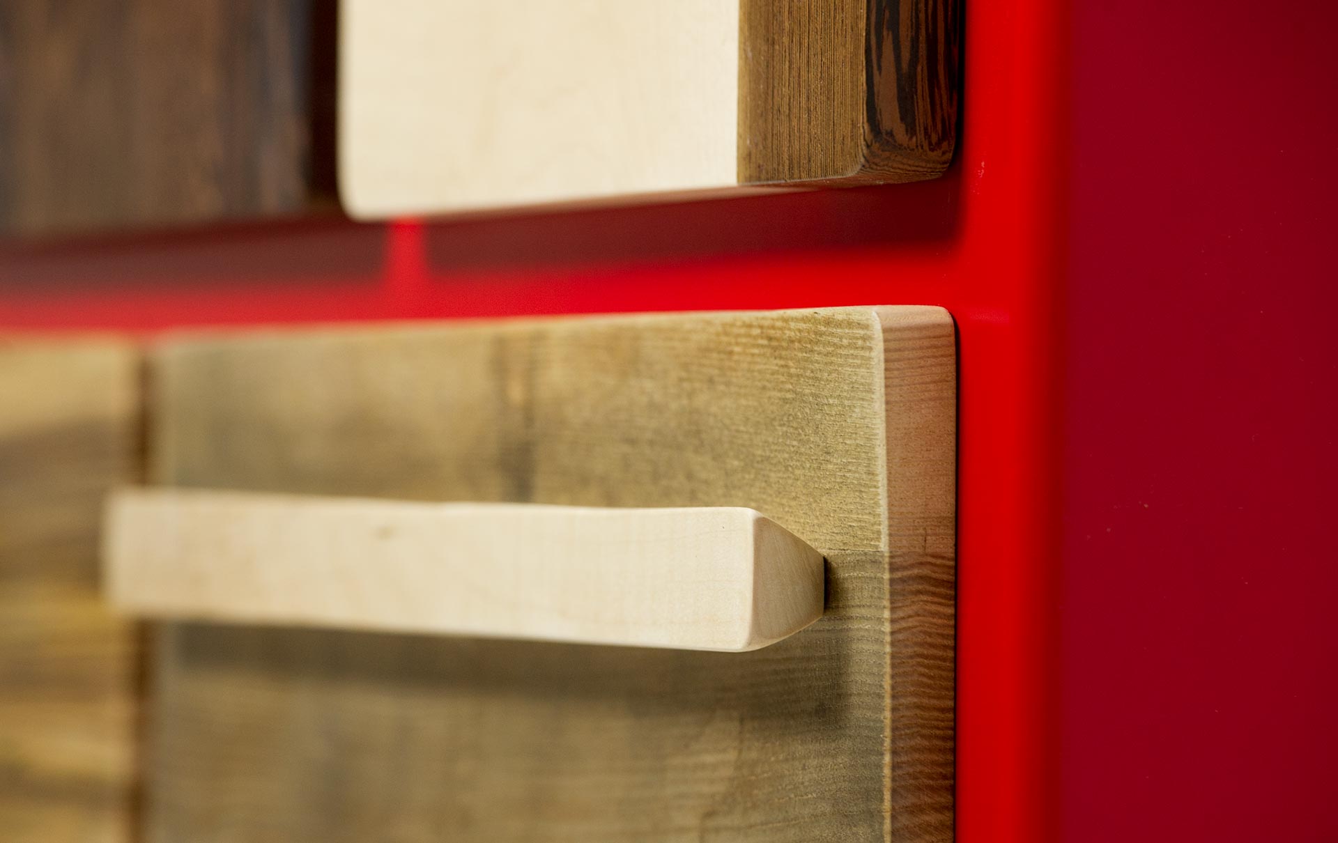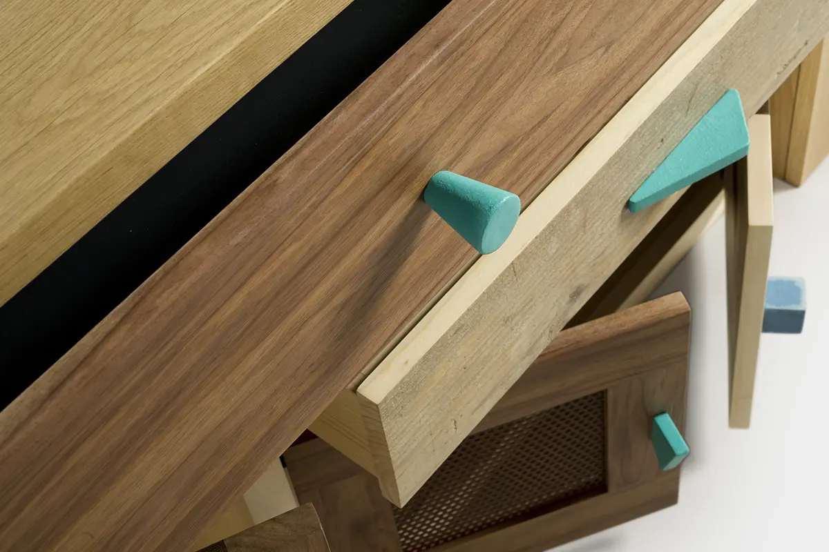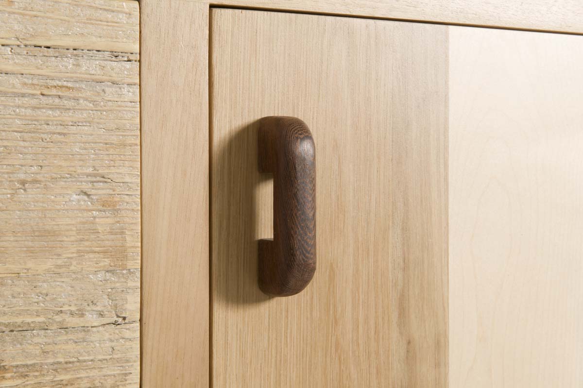 Le composizioni sono ulteriormente arricchite da maniglie e pomelli fatti a mano, di differenti forme e legni, che esaltano il carattere materico dei mobili.