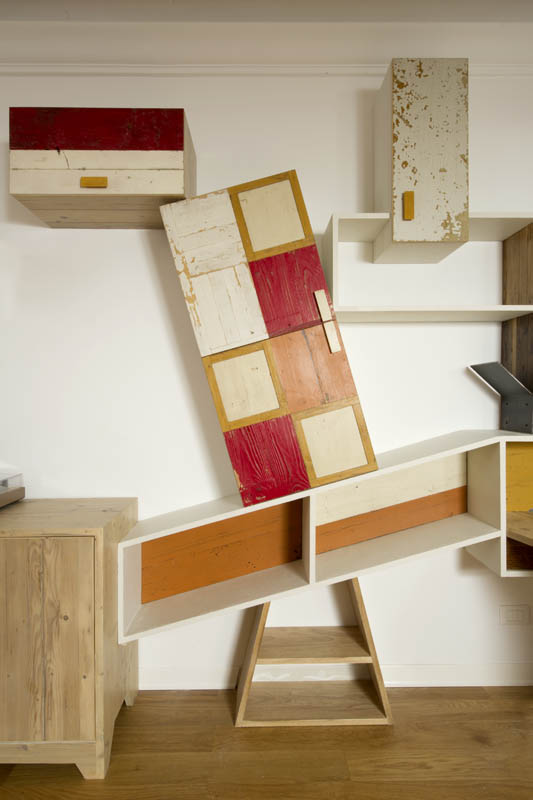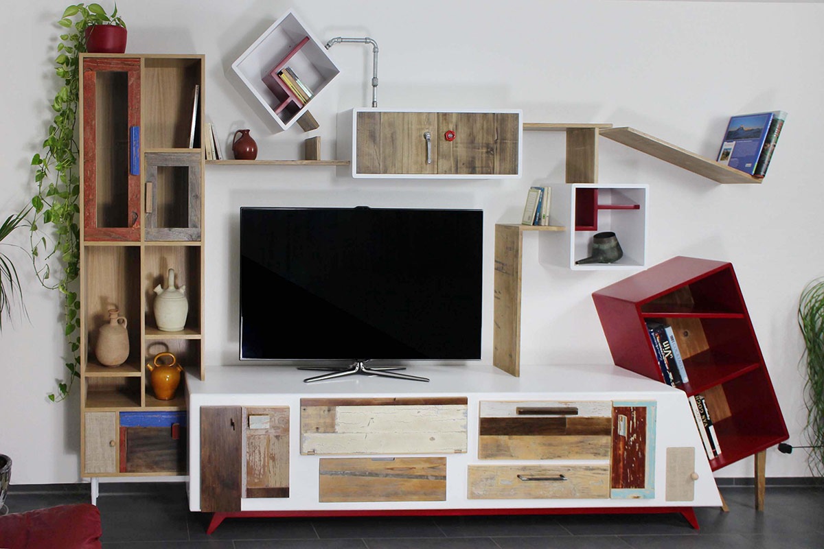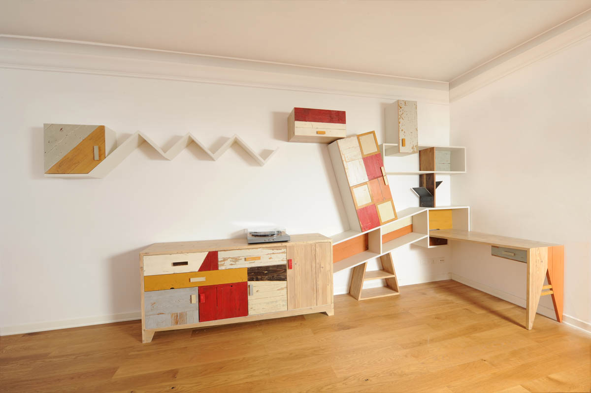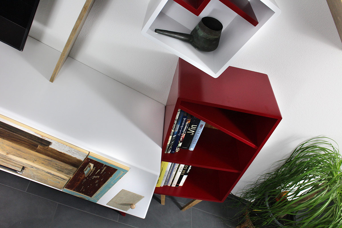Una delle nostre ultime creazioni, una parete attrezzata angolare, rappresenta perfettamente questa filosofia. Si tratta di una struttura sospesa che si snoda lungo la parete, con un mix di elementi in legno grezzo, superfici bianche, dettagli rossi e un tocco di giallo che crea un vivace contrasto. Mensole che si piegano e zigzagano, ripiani che si interrompono e cambiano direzione, moduli contenitori dalle forme irregolari: questa è la nostra visione di un’arredo contemporaneo che va oltre la semplice funzione.