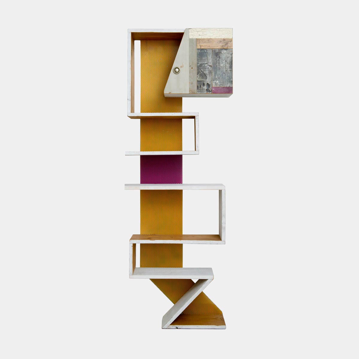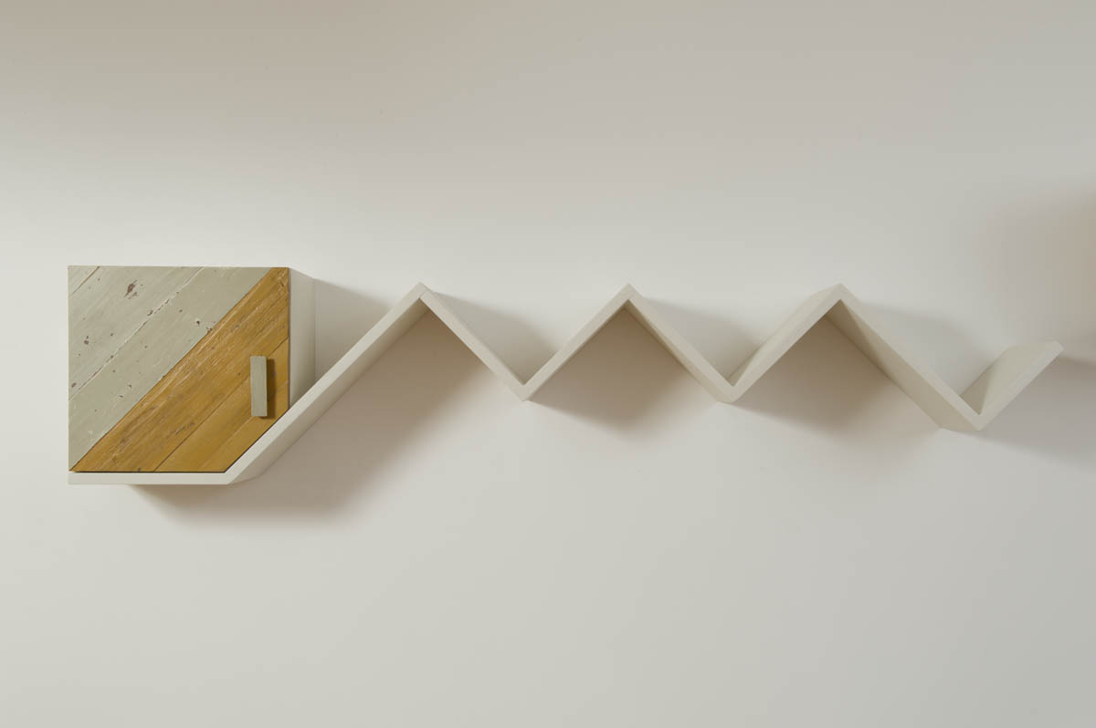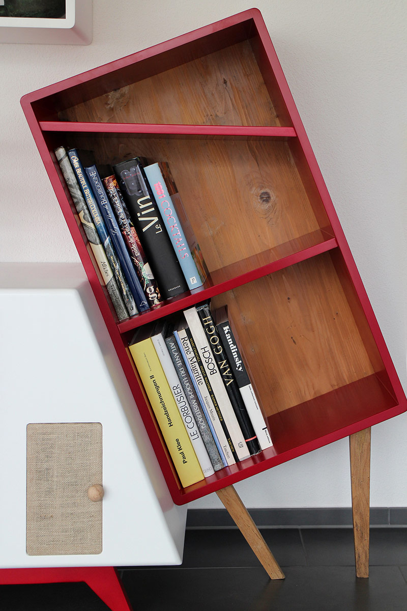 Una delle nostre ultime creazioni, una parete attrezzata angolare, rappresenta perfettamente questa filosofia. Si tratta di una struttura sospesa che si snoda lungo la parete, con un mix di elementi in legno grezzo, superfici bianche, dettagli rossi e un tocco di giallo che crea un vivace contrasto. Mensole che si piegano e zigzagano, ripiani che si interrompono e cambiano direzione, moduli contenitori dalle forme irregolari: questa è la nostra visione di un’arredo contemporaneo che va oltre la semplice funzione.