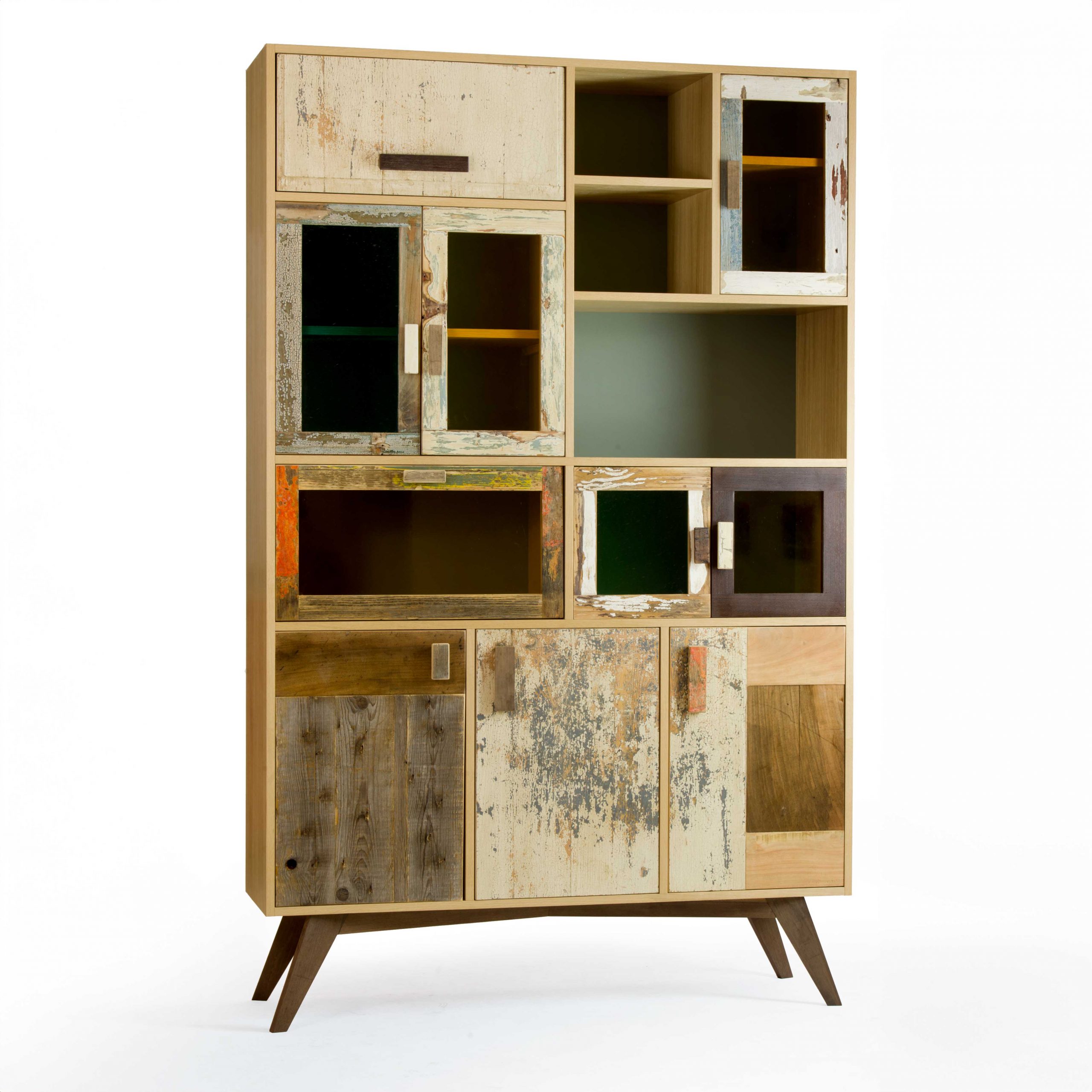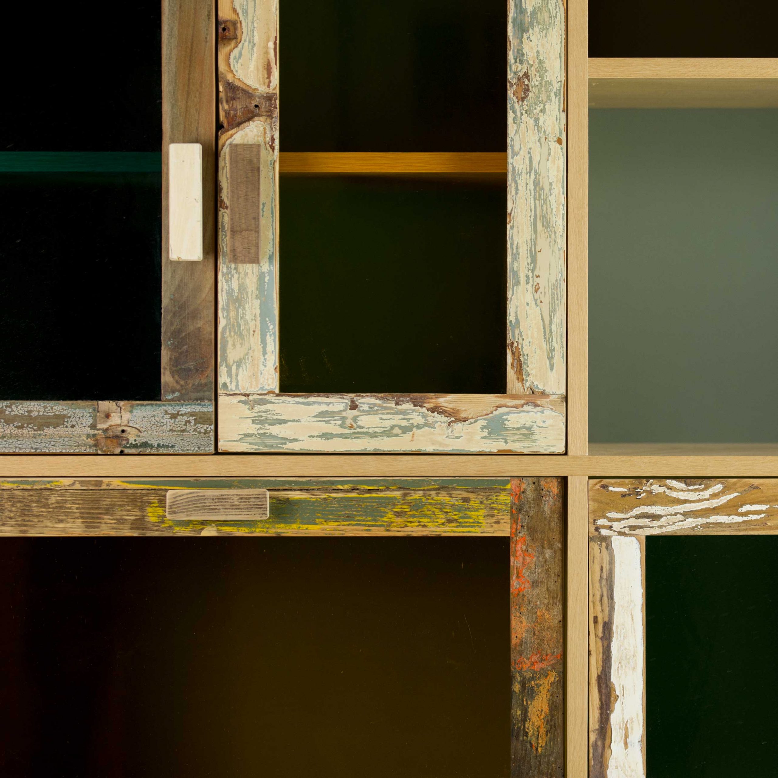 Ante e frontali dei cassetti sono costruite con legno massello nuovo e di recupero mixando  colori chiari  con le tonalità naturalmente ossidate del legno vecchio. Le   maniglie sono realizzate anch’esse in legno di recupero. le gambe sono realizzate con legno di wengè massello.