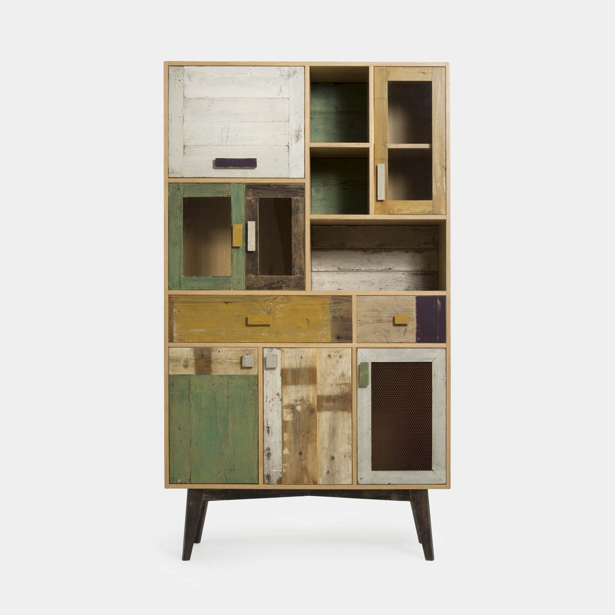 Pur essendo una credenza alta moderna, Lulù strizza l’occhio al passato, richiamando lo stile delle credenze con vetrine tradizionali, ma reinterpretato in chiave contemporanea. La scelta del legno di recupero, con le sue patine originali e i segni del tempo, richiama lo stile arte povera, noto per l’uso di materiali semplici e naturali, ma che qui viene arricchito da un design moderno e da soluzioni tecniche avanzate.