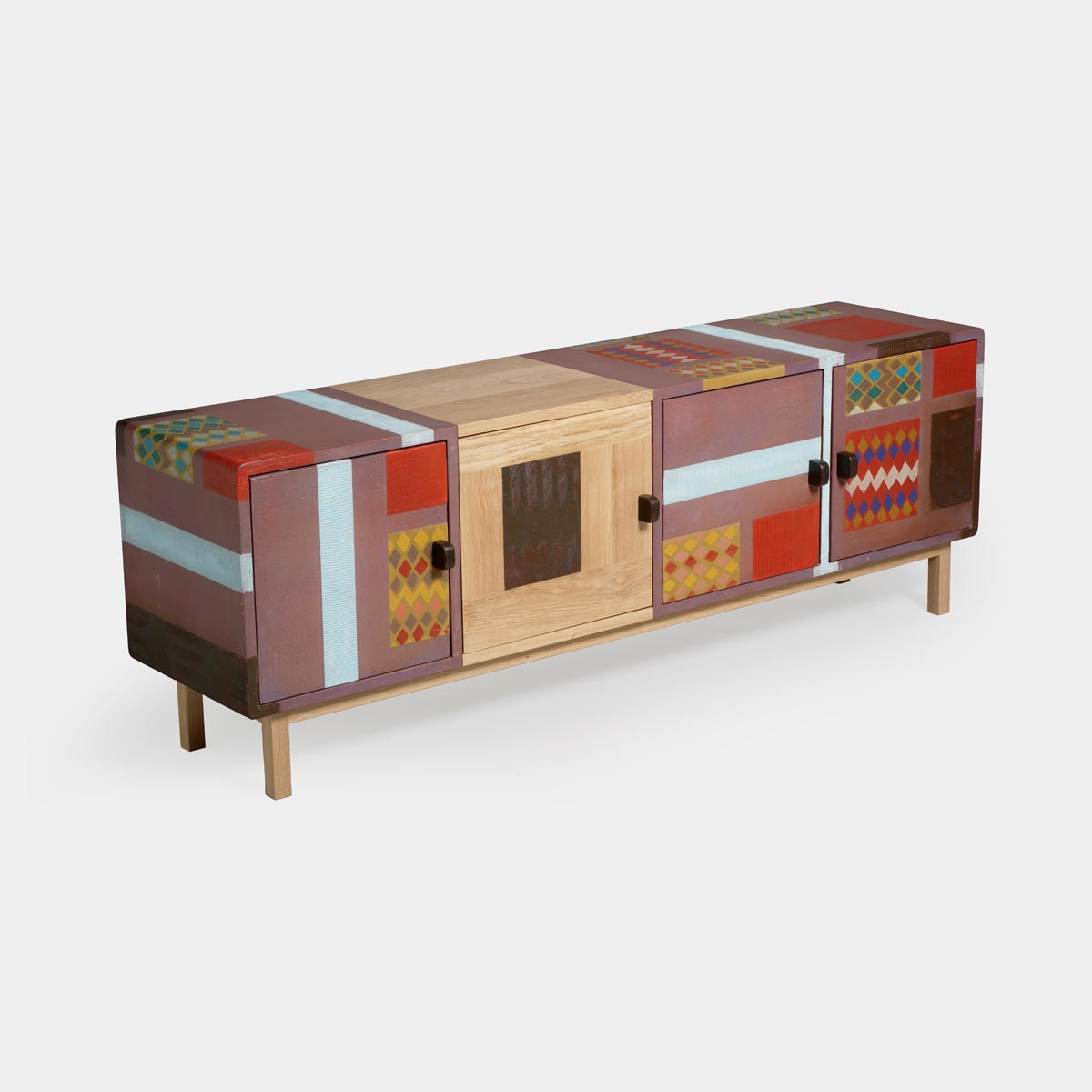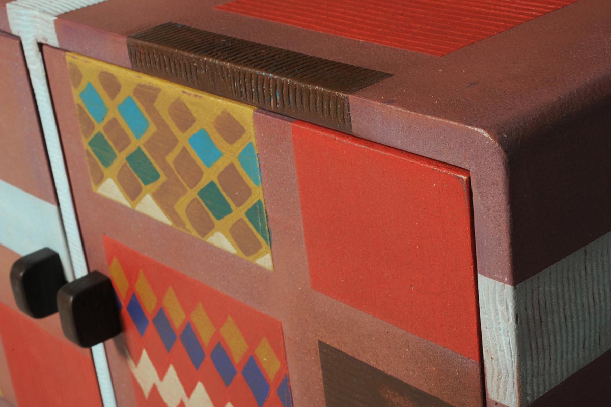 Credenza bassa con sportelli, ideale come mobile tv o mobile basso da salotto. La struttura è in legno listellare. La decorazione è effettuata a mano con microcemento a cui sono stati aggiunti pigmenti colorati. Le maniglie sono in legno massello nuovo.