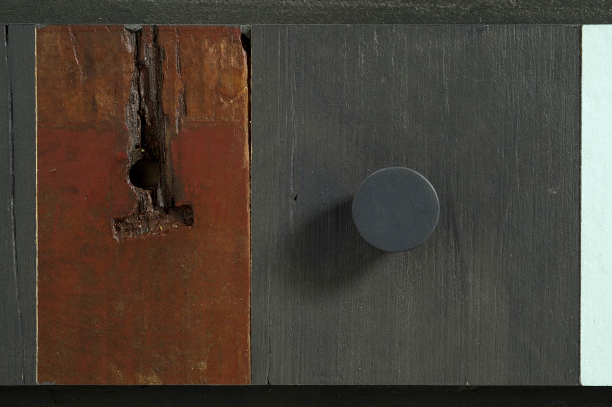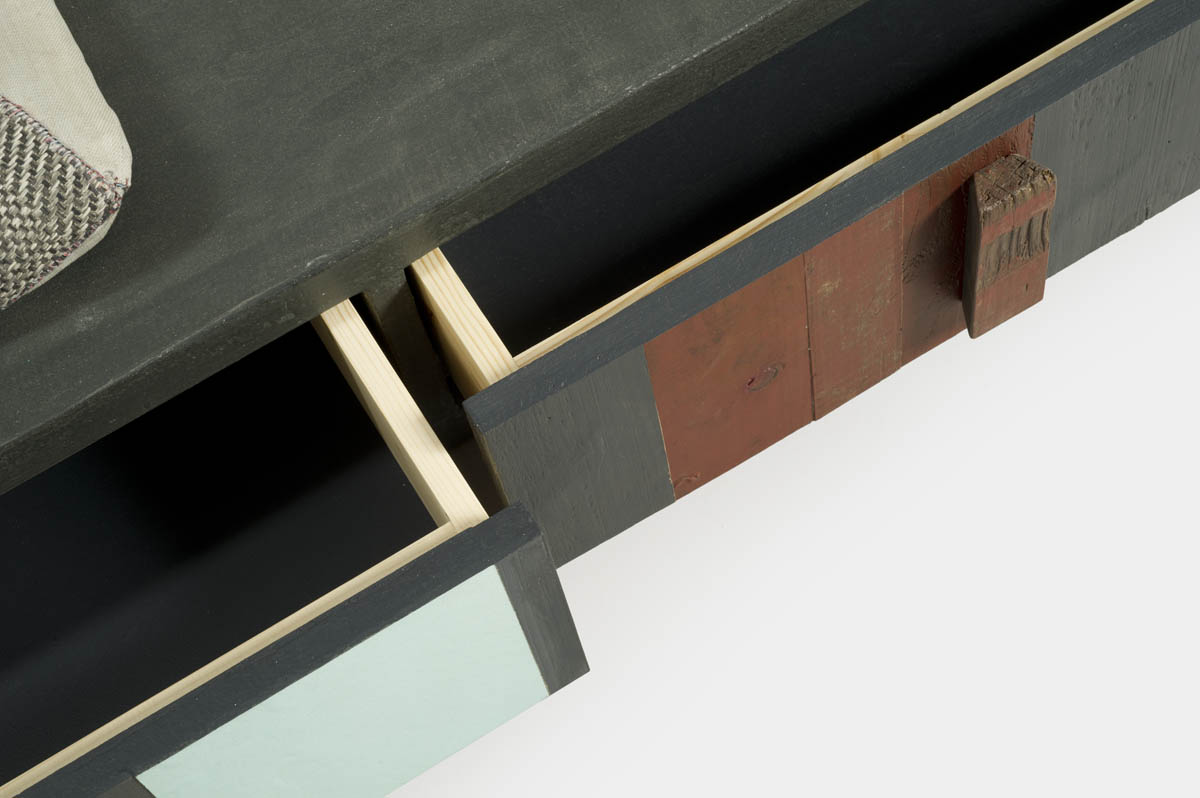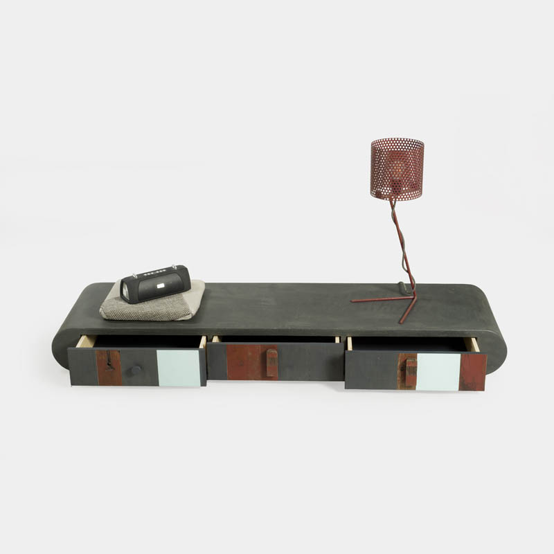 Mobile lungo basso con tre cassetti, stondato alle due estremità, che può essere usato anche come seduta da salotto, pouf o tavolino di fronte al divano. Rivestito in microcemento color grafite, frontali dei cassetti in legno di recupero.