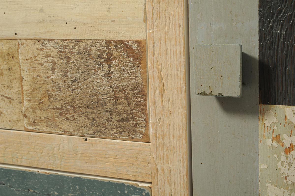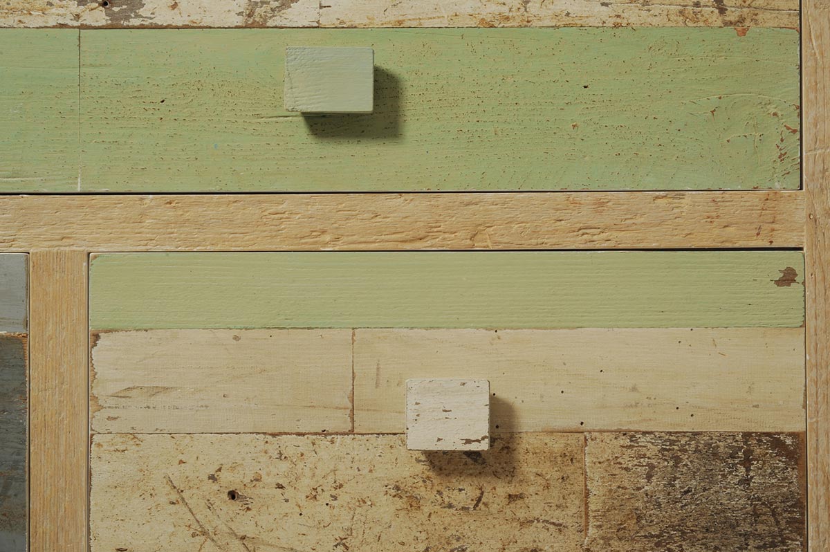 La struttura della credenza è realizzata in legno di abete di recupero, mentre i frontali (così come maniglie e piedi del mobile) sono un mix di legni di recupero di varie tonalità ed essenze.