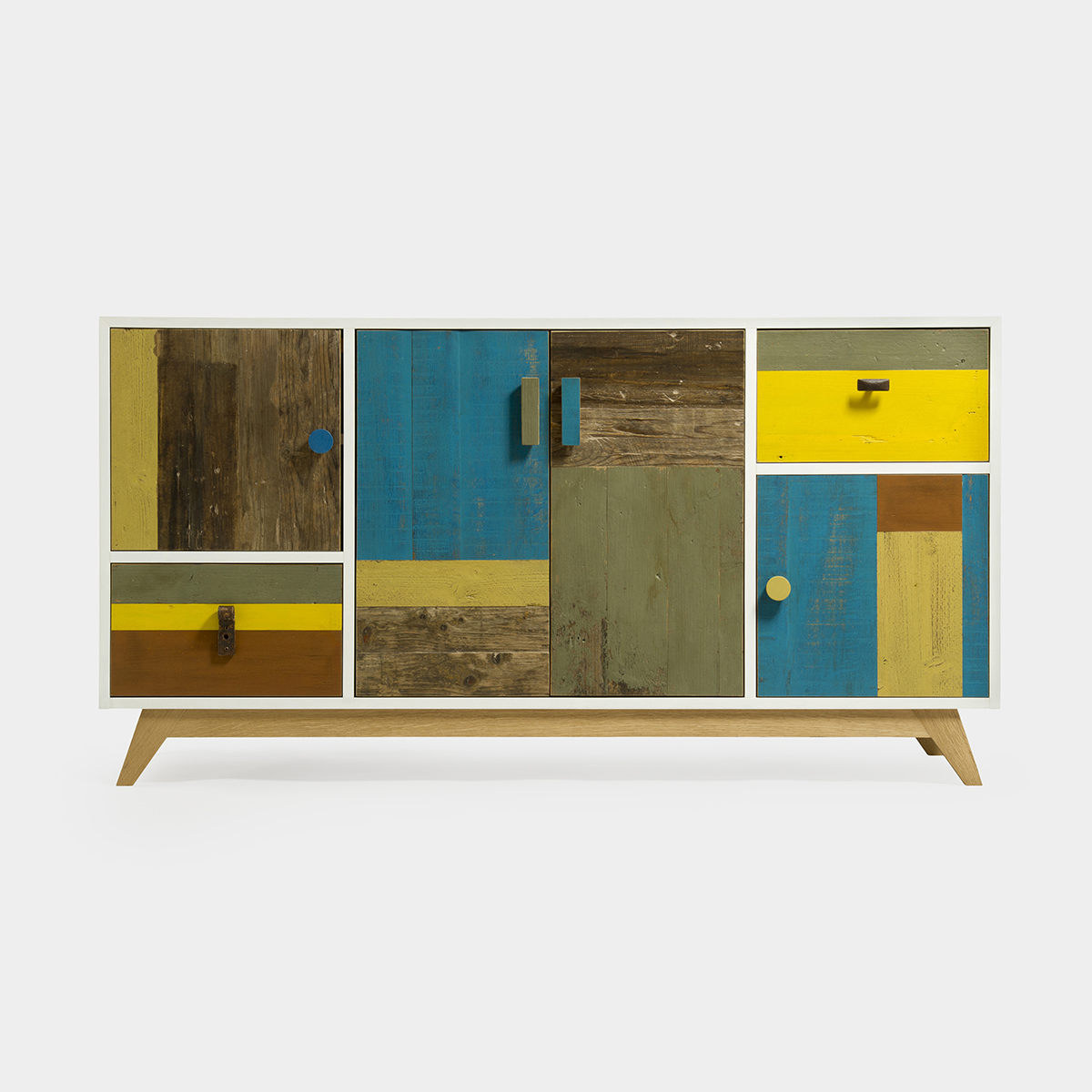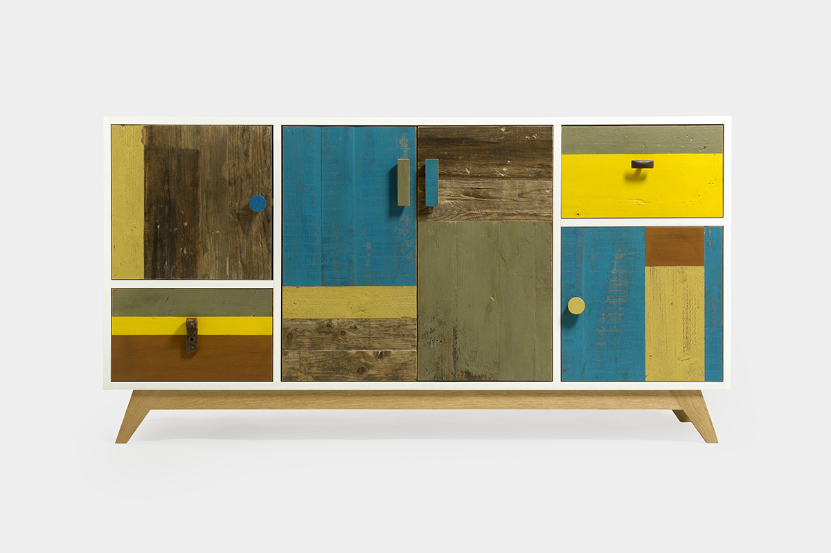 La struttura di Rella è realizzata in legno listellare di rovere verniciato bianco a poro aperto, che dona leggerezza e luminosità all’ambiente. Il vero tratto distintivo di questa credenza ingresso sono però i frontali, realizzati in legno di recupero colorato, che creano un effetto grafico unico e giocoso. Ogni pezzo di legno utilizzato nei frontali ha una storia e un carattere proprio, rendendo ogni credenza unica e irripetibile.