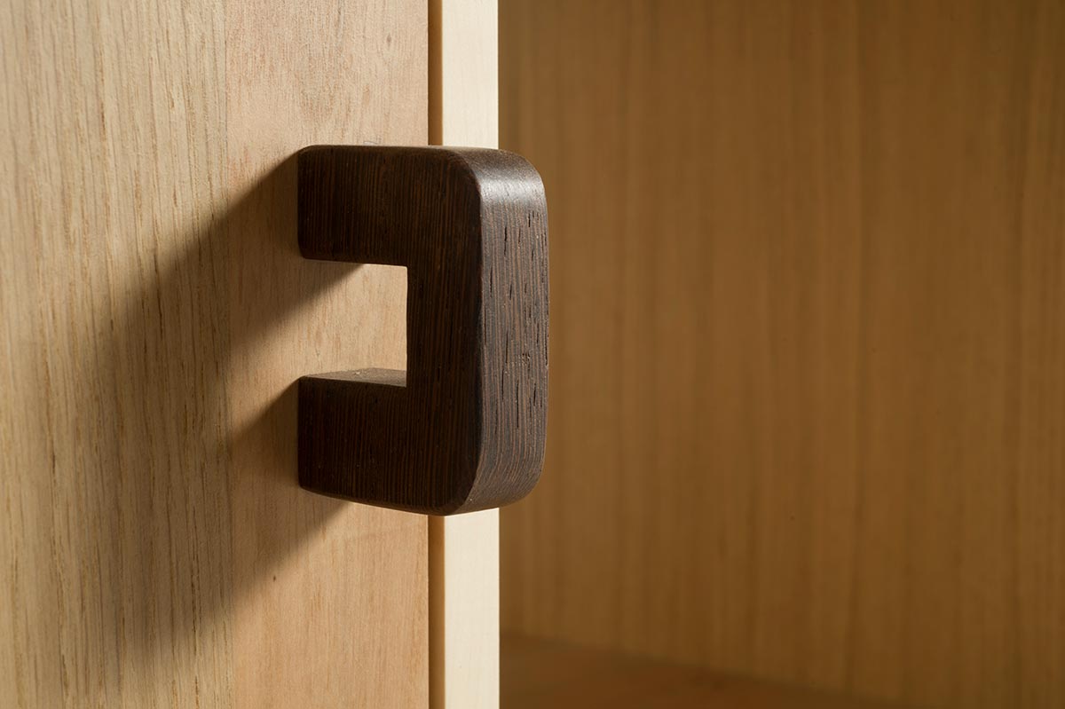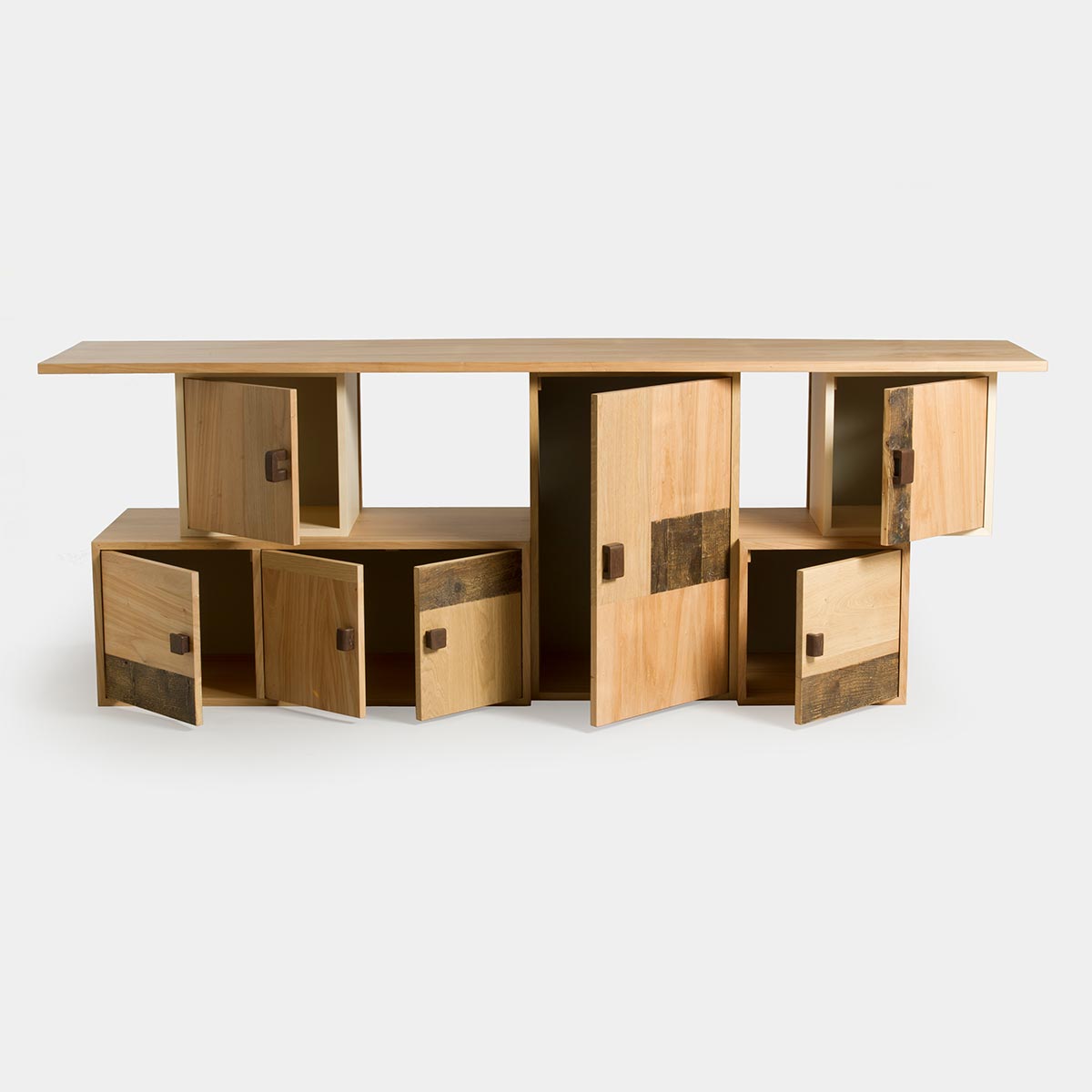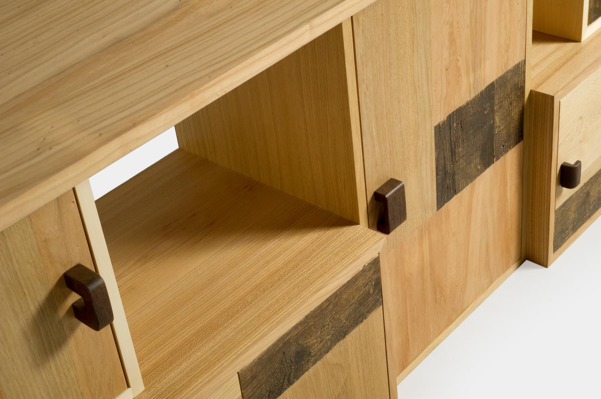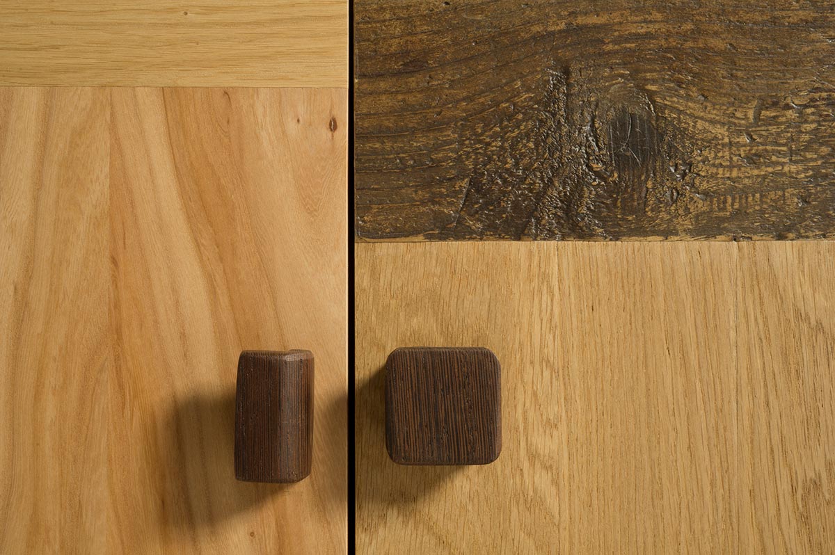 Ogni singolo modulo è chiuso da uno o più sportelli in legno di olmo nuovo e legno di recupero. La composizione dei frontali è basata sul contrasto tra le tonalità pastello propria del legno di olmo e le macchie scure date dall’uso del legno antico recuperato. Le maniglie sono realizzate in legno massello di wengè e sono una diversa dall’altra. La struttura dei moduli è invece realizzata con legno listellare di olmo e acero.
