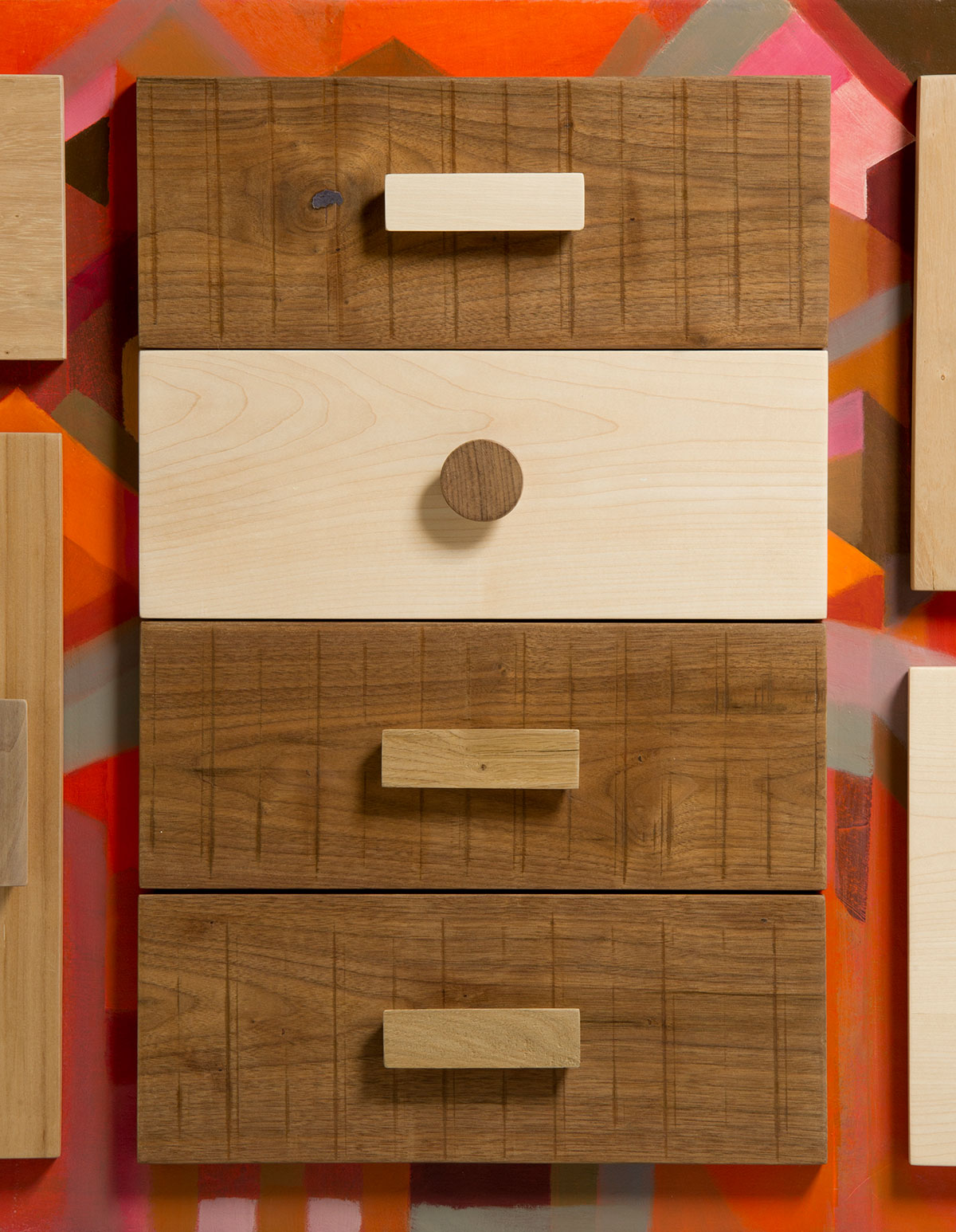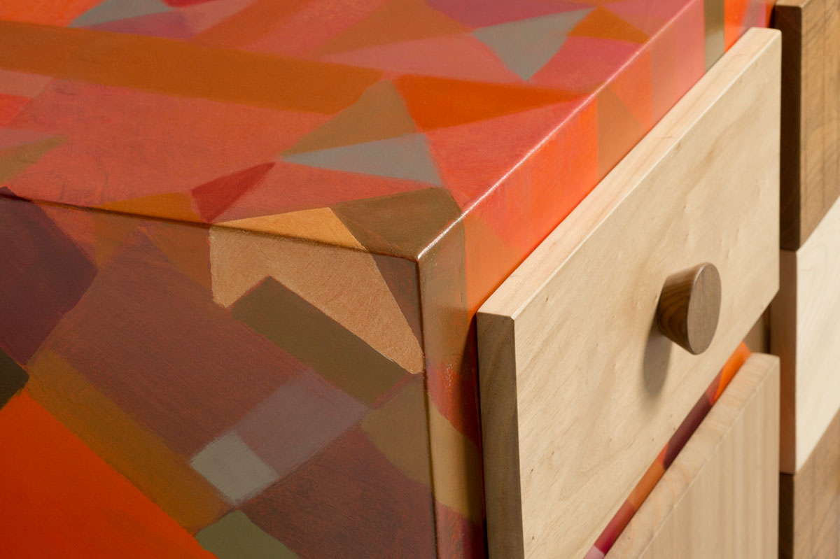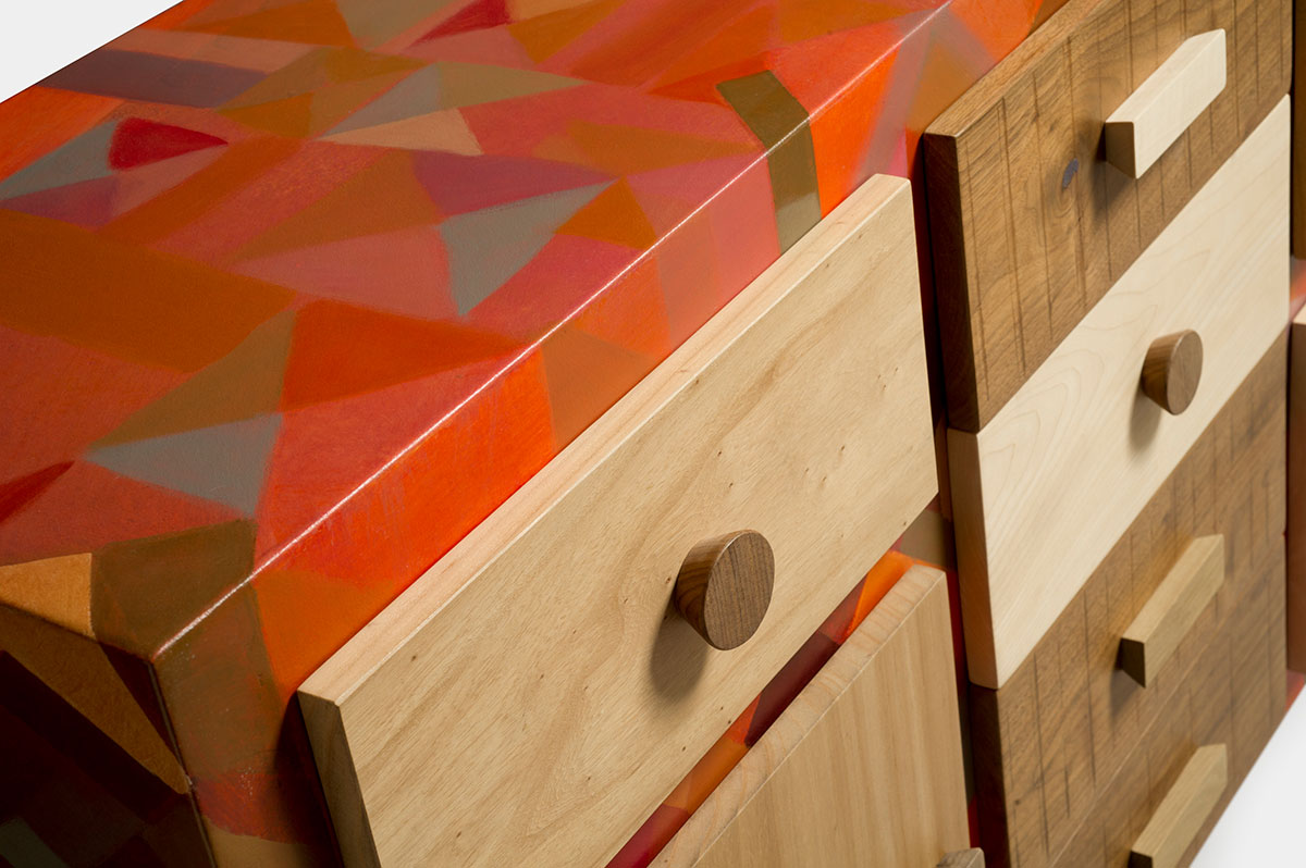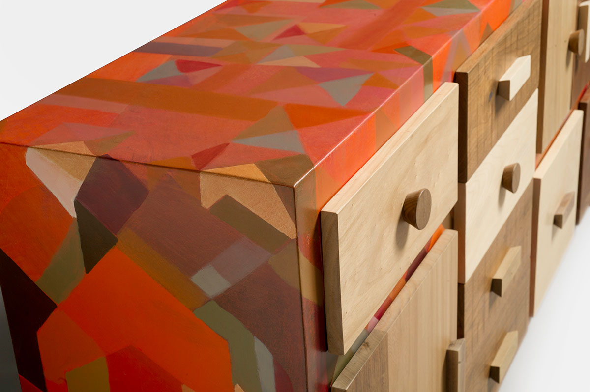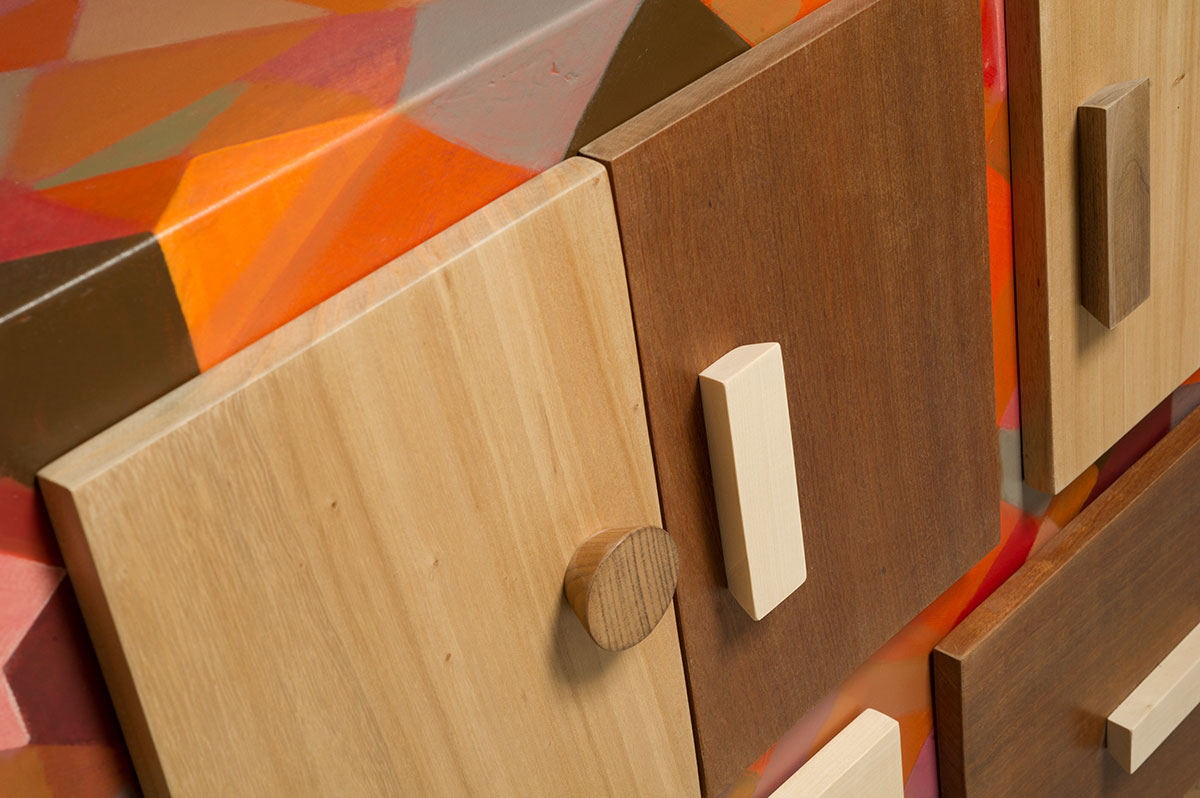 La scelta del microcemento come finitura per il corpo della credenza è un esempio di come i materiali moderni possano essere utilizzati per innovare il design dei mobili tradizionali. Il microcemento non solo è resistente e facile da mantenere, ma offre anche una superficie liscia e uniforme che può essere colorata in una vasta gamma di tonalità. Nel caso di questa credenza, i toni dell’arancio e del rosso, combinati con altre sfumature, creano un effetto cromatico vivace e dinamico, perfetto per un soggiorno dallo stile moderno e audace.