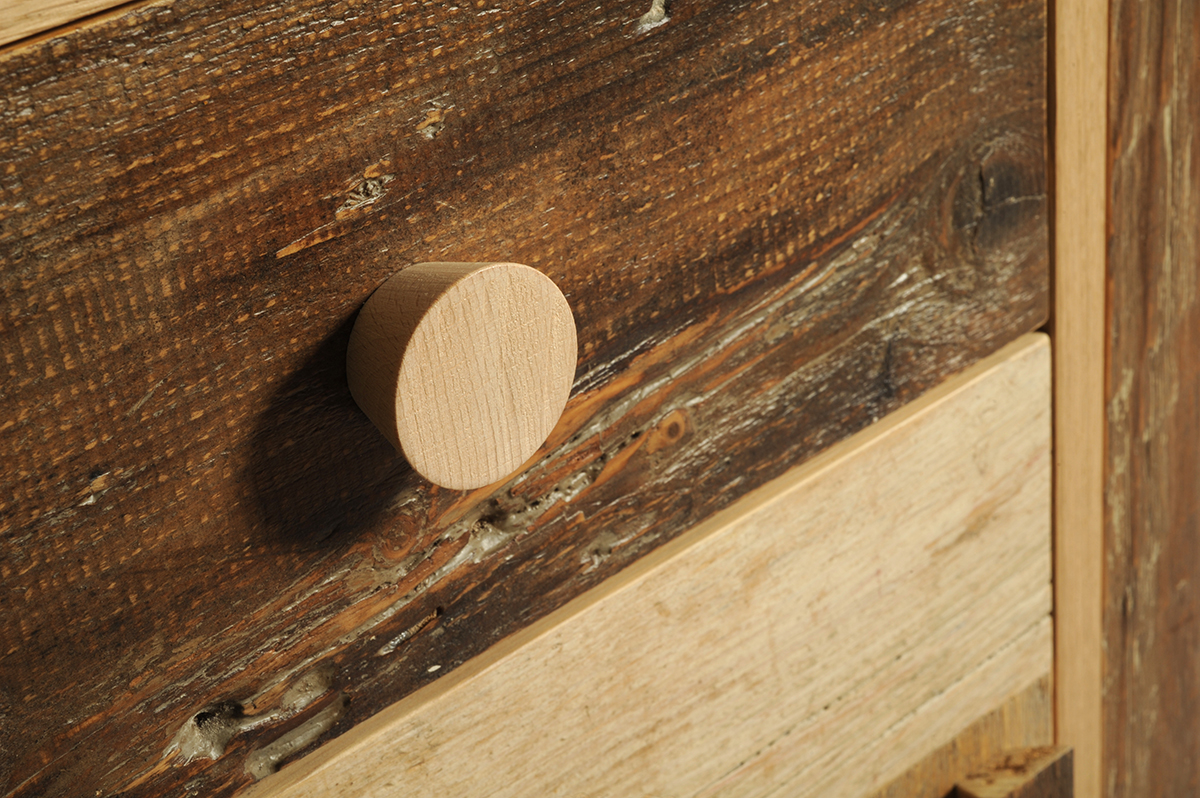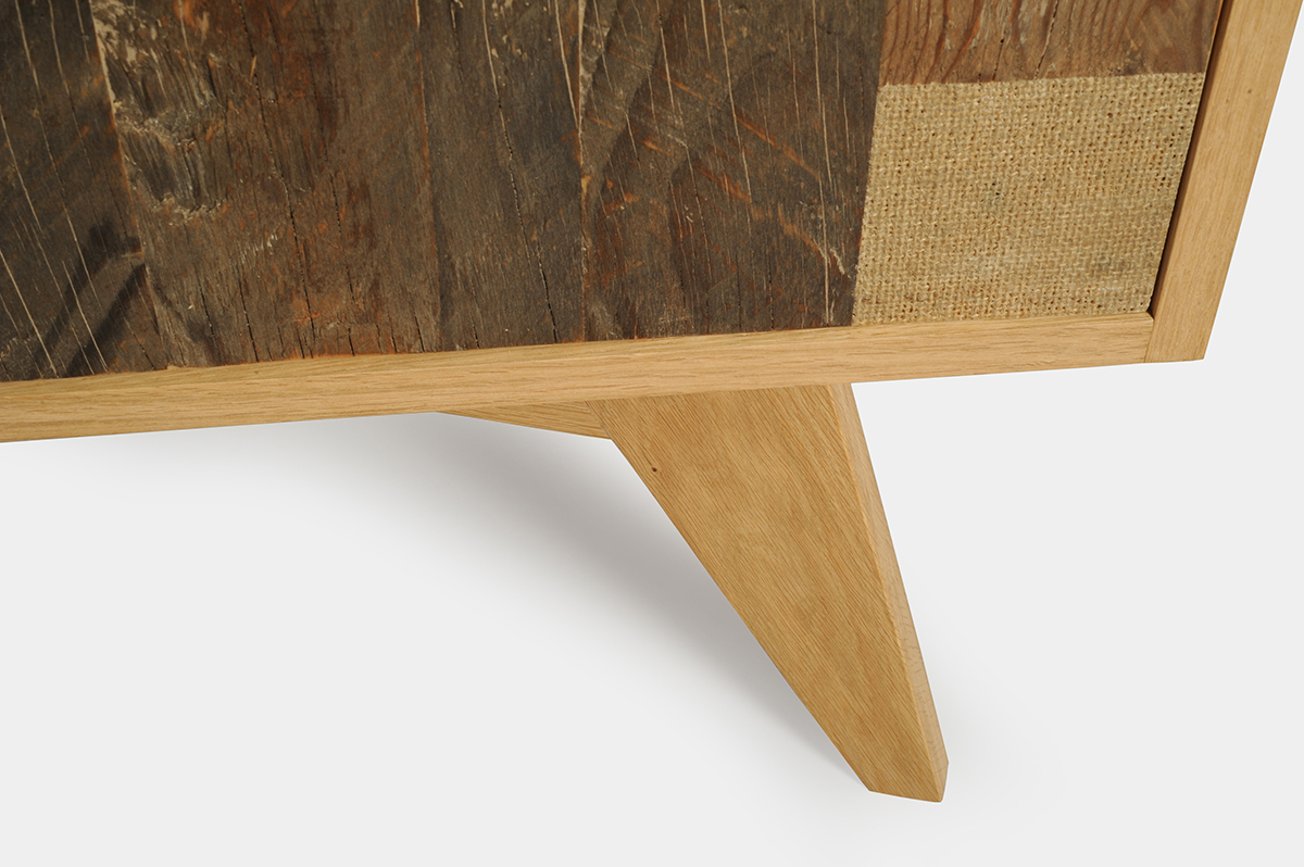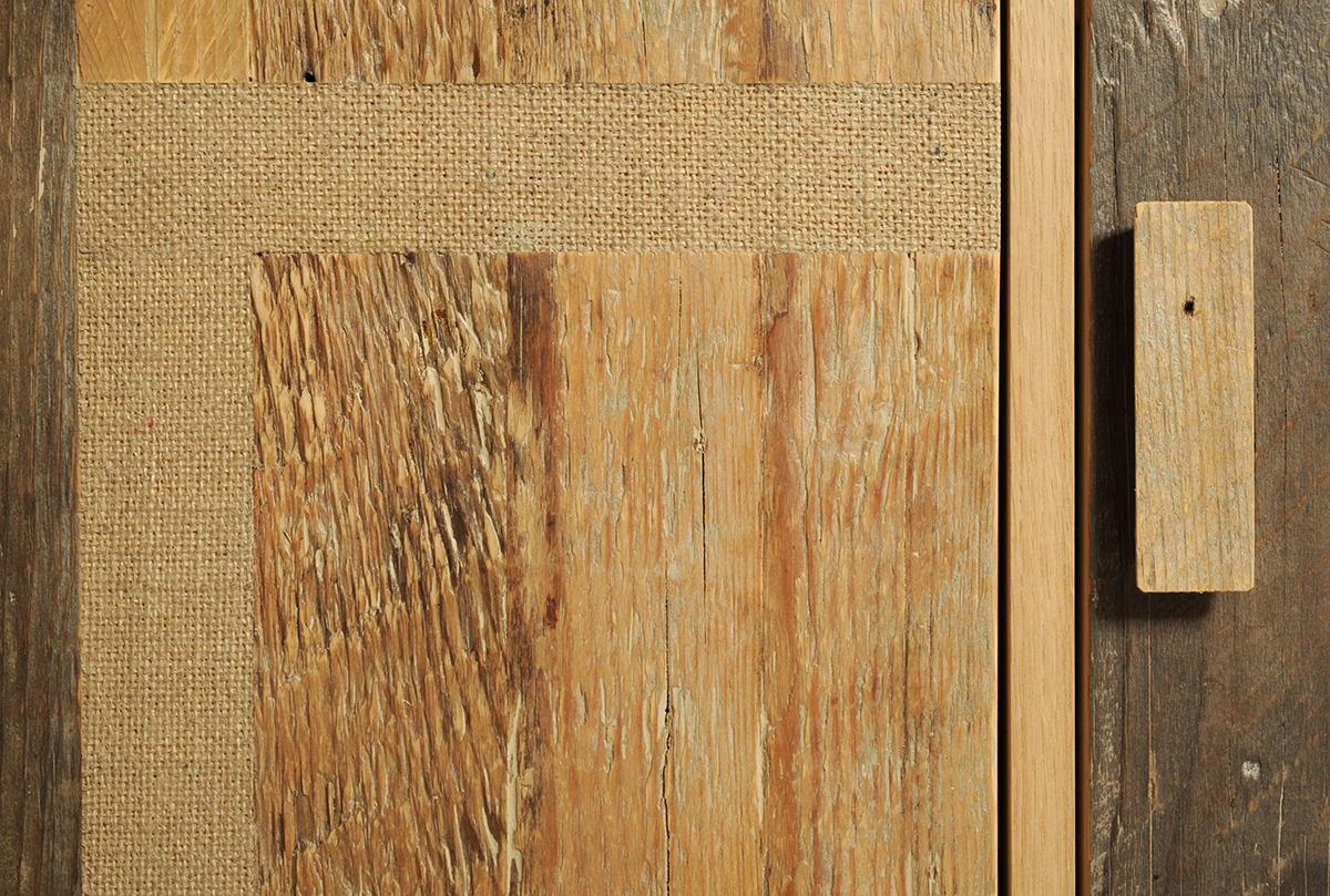 legno listellare di rovere, legno di recupero, juta, vetro