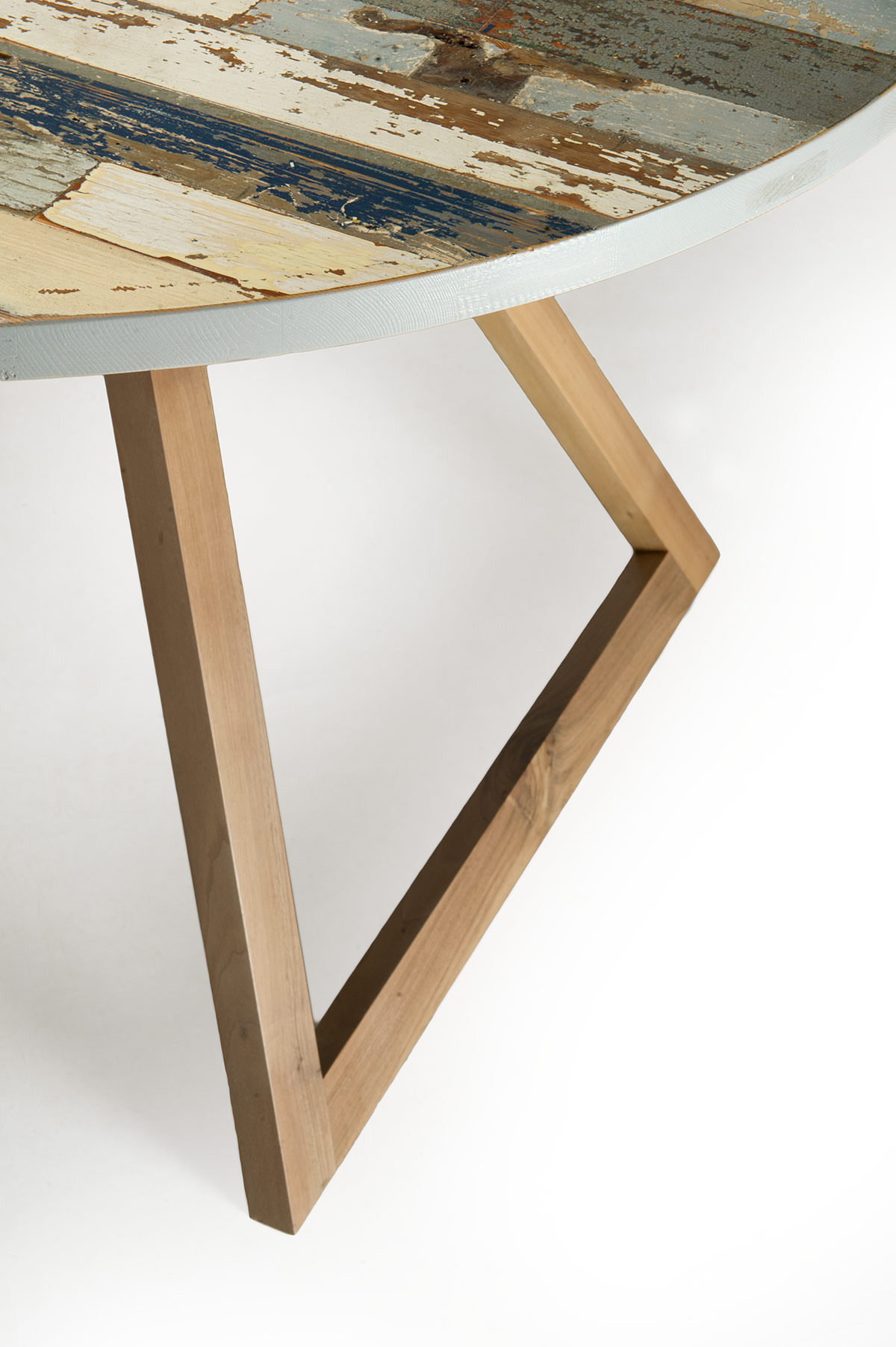 Il tavolo Elico, ad esempio, è un perfetto rappresentante di questa categoria. Progettato e realizzato nel laboratorio Laquercia21, questo tavolo unisce il fascino del legno di recupero con un design moderno e funzionale. Il piano intarsiato, con i suoi toni di bianco, grigio, celeste e blu, non solo conferisce al tavolo un’estetica unica, ma anche una storia, raccontata attraverso le patine e le superfici segnate dal tempo.