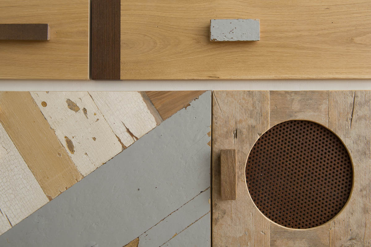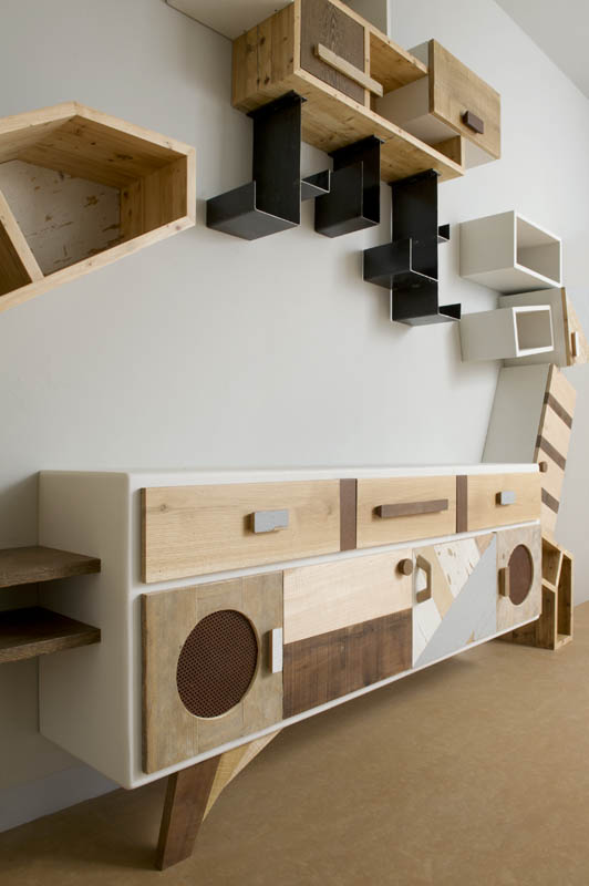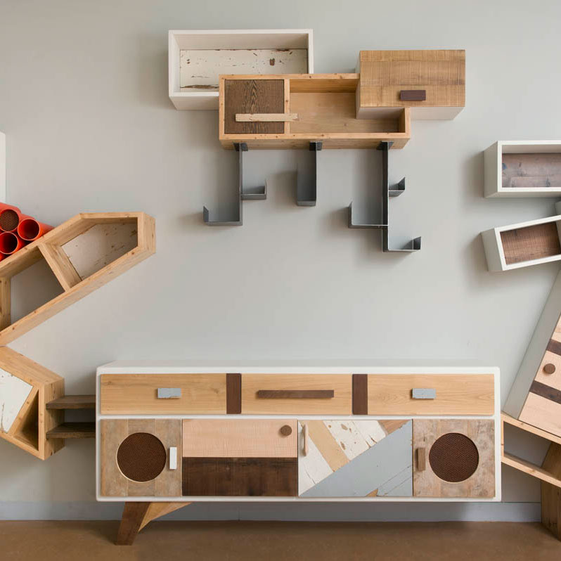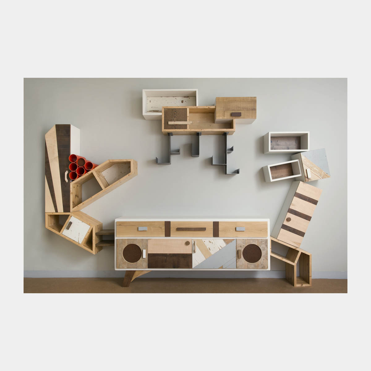 Una parete attrezzata moderna come Granchio sfida le convenzioni tradizionali, offrendo una soluzione d’arredo che è tanto estetica quanto funzionale. Con la sua disposizione asimmetrica e l’uso di materiali misti, Granchio rappresenta l’evoluzione delle pareti attrezzate, combinando funzionalità e un forte impatto visivo. Gli elementi sospesi e l’integrazione di materiali come legno di recupero e ferro pressopiegato non solo aumentano la praticità, ma creano anche un effetto scenografico che rende unico ogni soggiorno.