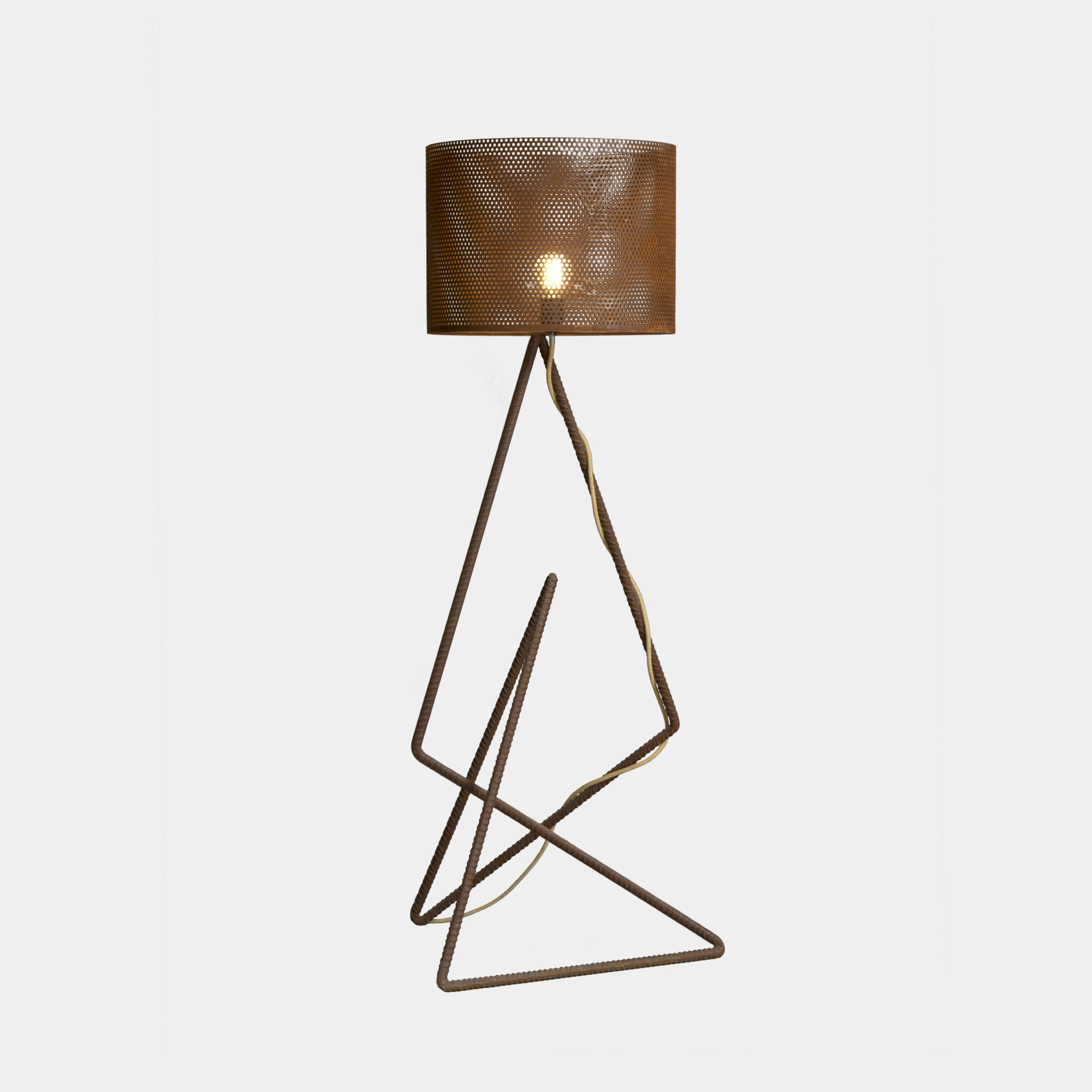 Lampada da terra formata da tondino di ferro nervato e lamiera forata della serie AT. Pezzo unico disponibile.