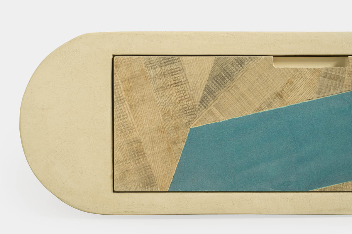 Il mobile basso con tre cassetti stondato alle estremità è una soluzione versatile per qualsiasi soggiorno. Rivestito in microcemento color sabbia, con frontali dei cassetti in legno di recupero e interno in legno di abete, questo mobile unisce estetica moderna e materiali sostenibili. Può essere utilizzato come seduta, pouf o tavolino, oltre che come mobile basso TV, offrendo spazio di stoccaggio e funzionalità. Ideale per chi desidera un elemento d’arredo multifunzionale, Resaca#2 si adatta perfettamente a diversi ambienti, mantenendo uno stile elegante e contemporaneo.
