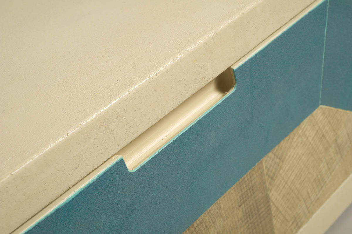 Mobile basso con tre cassetti, stondato alle due estremità, che può essere usato anche come seduta da salotto, pouf o tavolino di fronte al divano. Rivestito in microcemento color sabbia, frontali dei cassetti in legno di recupero, interno cassetti in legno di abete.