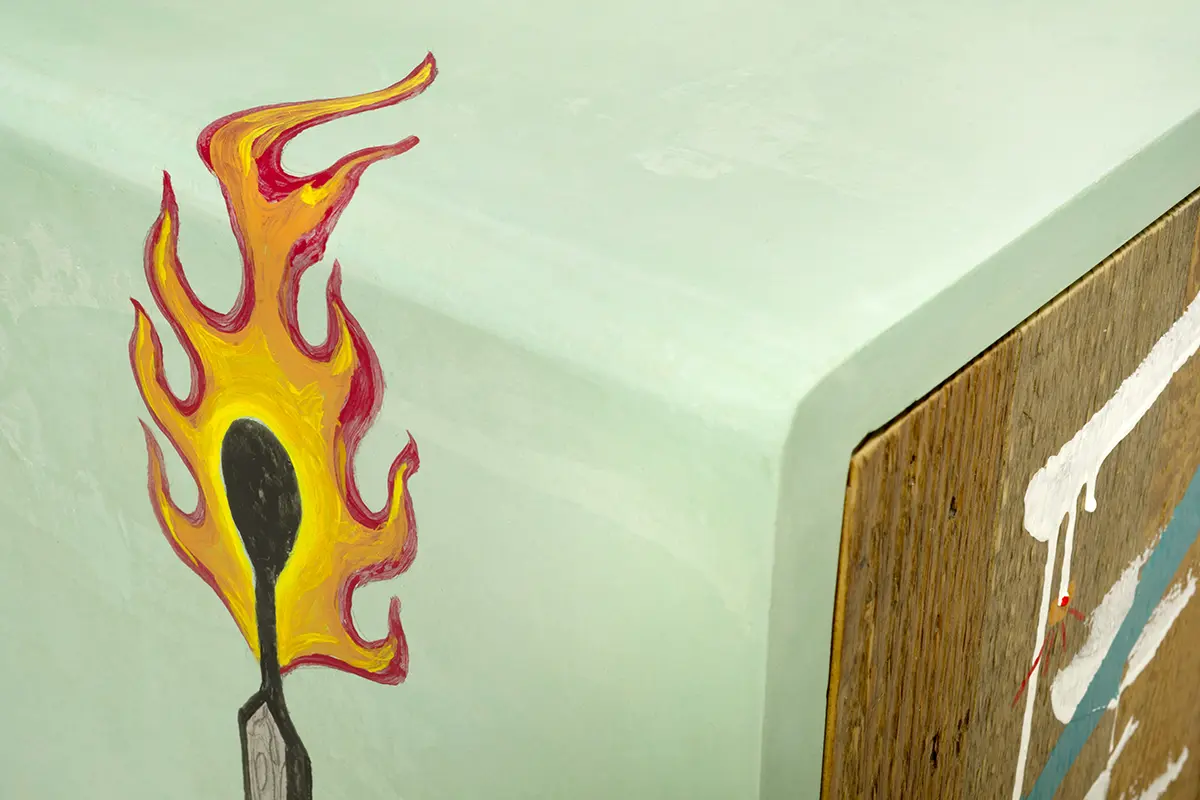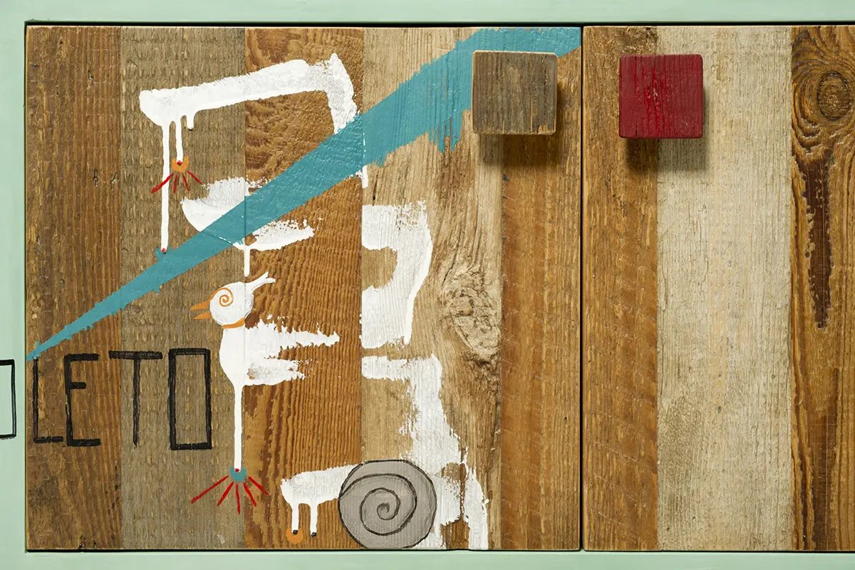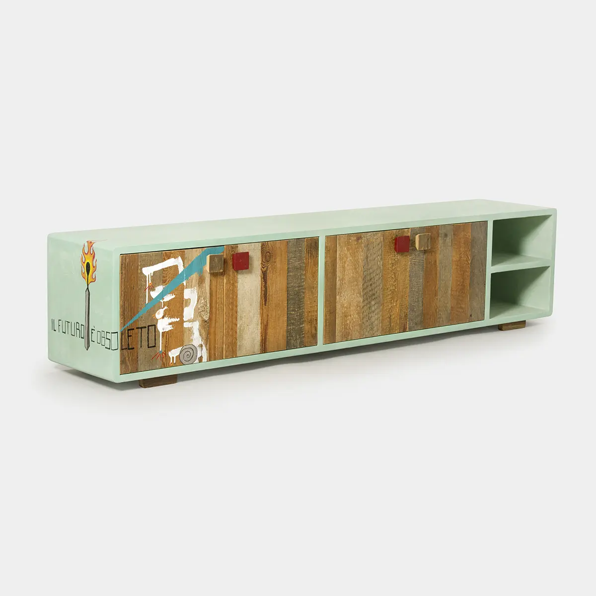 Le ante del mobile sono realizzate in legno di abete di recupero, un materiale sostenibile che riflette l’impegno di Laquercia21 verso un design responsabile. I pomelli, due dei quali dipinti di rosso, aggiungono un tocco di vivacità, creando un contrasto cromatico accattivante.