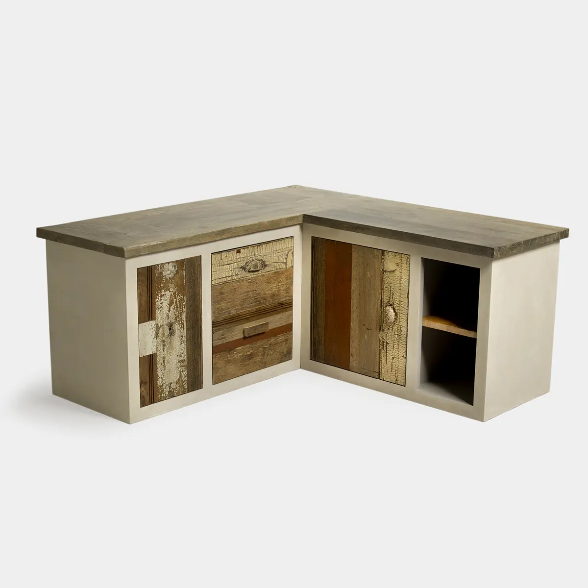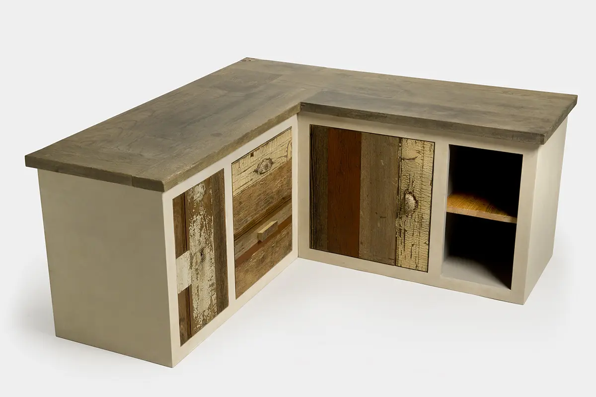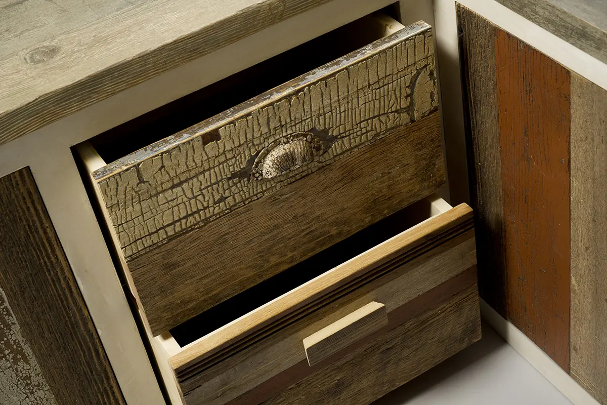 La struttura del mobile è una laccatura materica ottenuta con resina stesa a spatola, mentre il top è realizzato con un patchwork di legno di recupero di varie essenze, dal noce all’abete.