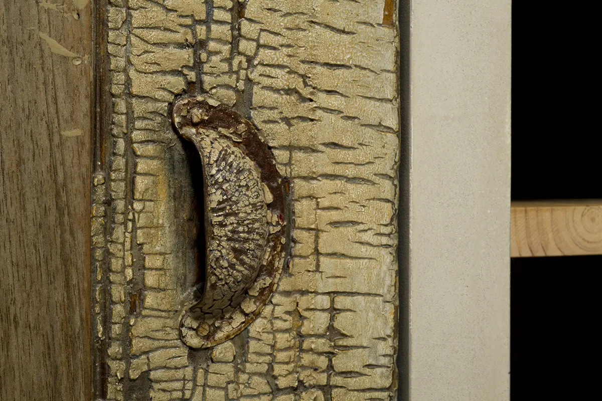 Due delle maniglie utilizzate sono anch’esse di recupero, in ottone lavorato ricoperto dal crachelè della vecchia vernice.
