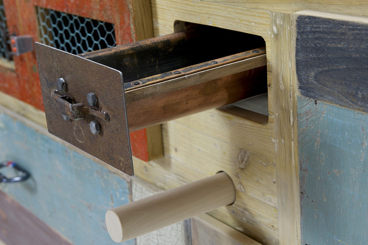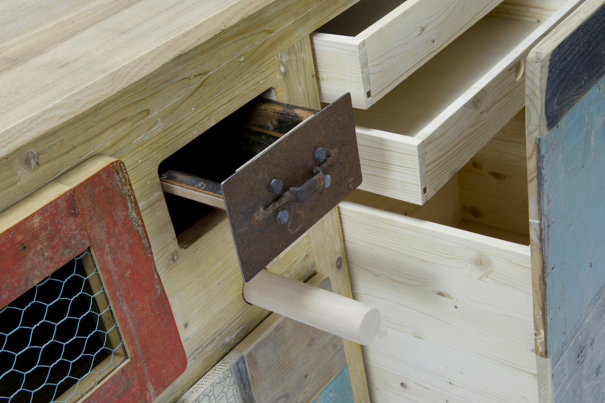 I frontali sono tutti realizzati con un patchwork di legni di recupero color arancio, azzurro, grigio e bianco. Le maniglie sono ottenute da vari oggetti di recupero in metallo.