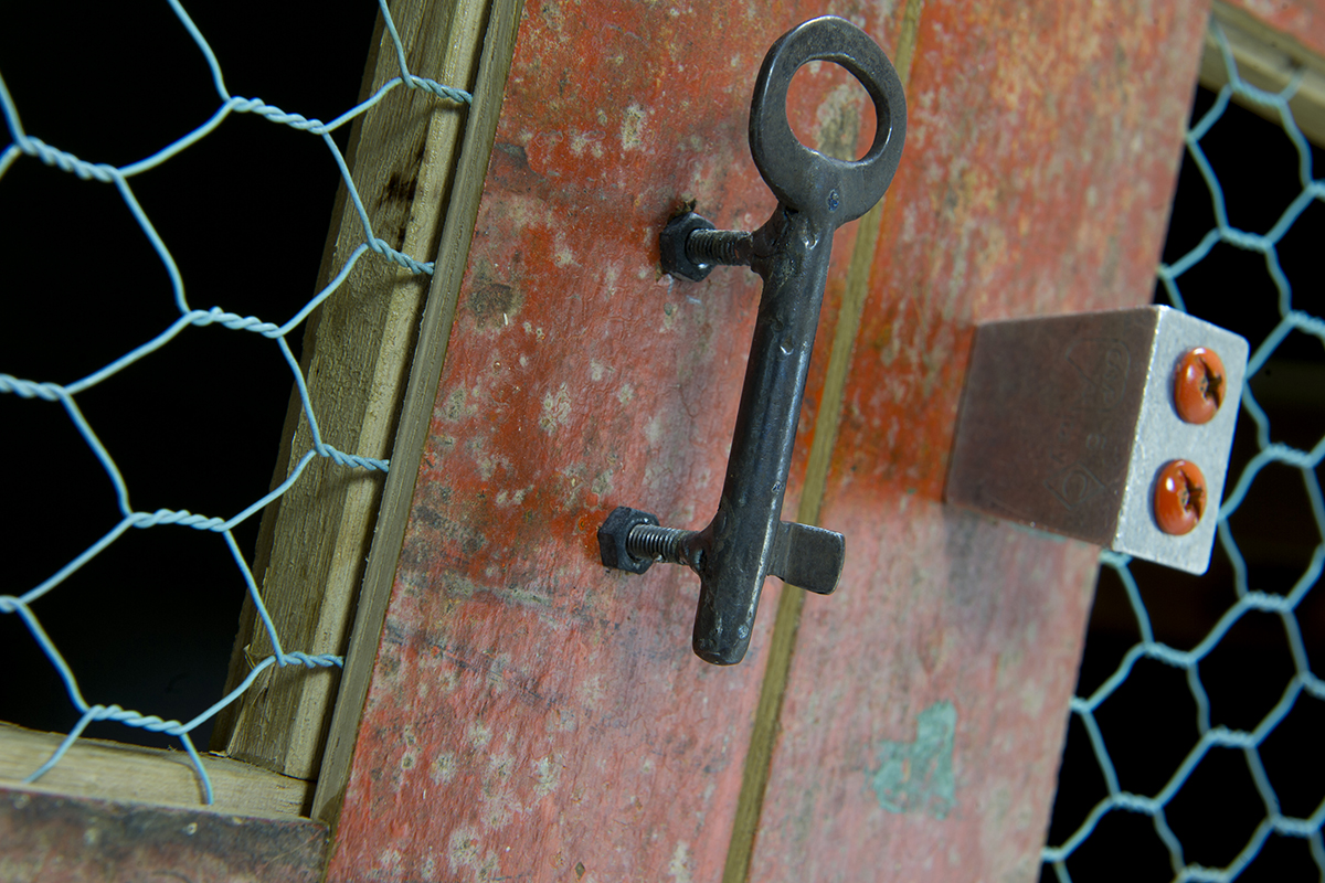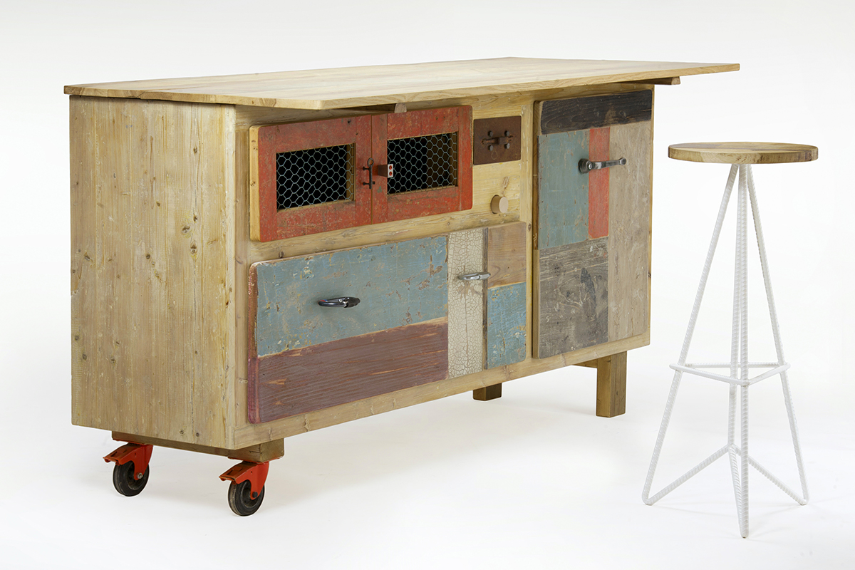 La struttura del mobile è in legno di abete di recupero ed è suddivisa in 3 sezioni: in basso un grande cassettone utile per alloggiare pentole, stoviglie e attrezzi ingombranti da cucina, a lato un ampio vano con ripiani chiuso da un’anta unica, in alto un vano largo chiuso da 2 antine a telaio e retina esagonale metallica, pensato per alloggiare preparati che necessitano di costante areazione. Chiudono la composizione 2 accessori: tagliere e mattarello alloggiati nel mobile ed estraibili frontalmente.