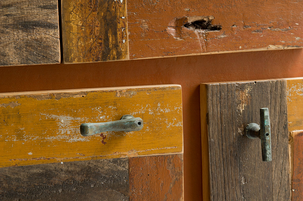 A controbilanciare queste calde nuances autunnali ci sono le maniglie di ottone ossidato, tutte recuperate da vecchie porte primi 900, il cui verde ramato risalta costellando di punti di luce tutto il mobile.
