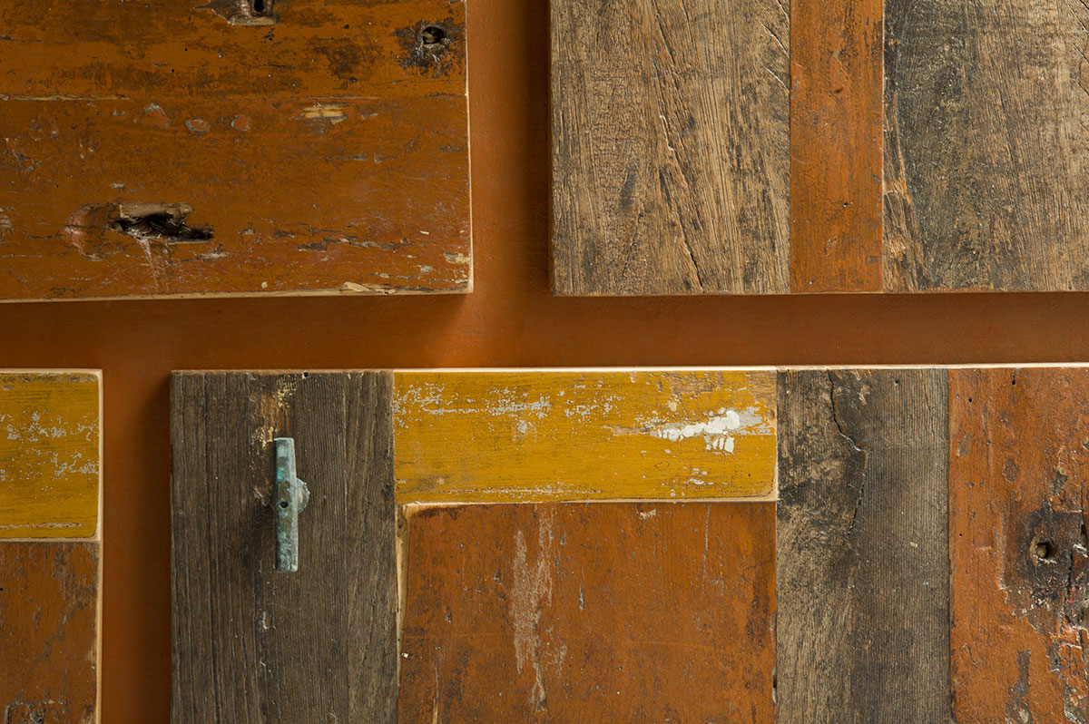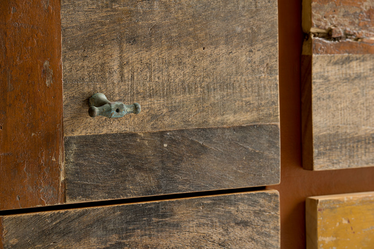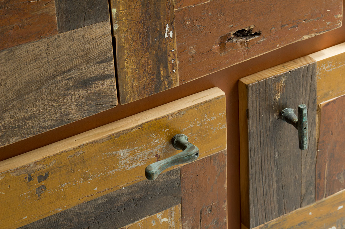Lo scheletro del mobile, di portamento minimale e rigorose proporzioni, è vestito di una finitura particolare, realizzata con microcemento steso a spatola su tutta la superficie. Le tonalità naturali di questa resina sono dovute all’uso di terre naturali (ocra e terra di Siena) come coloranti. Le ante e i frontali dei cassetti, tutti realizzati in legno massello di recupero, dialogano con questa particolare laccatura attraverso i toni del legno naturale ossidato, l’ocra e il marrone.