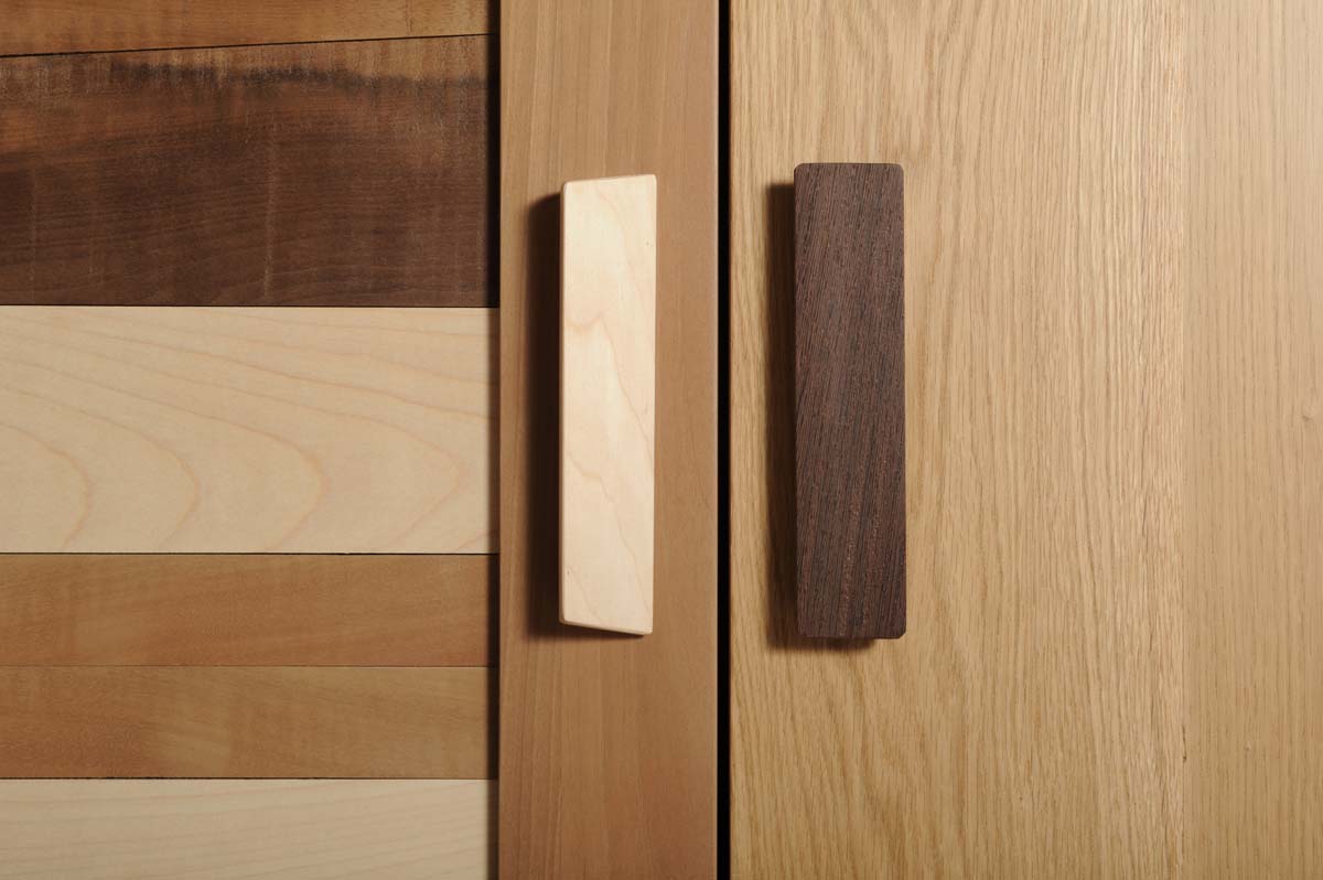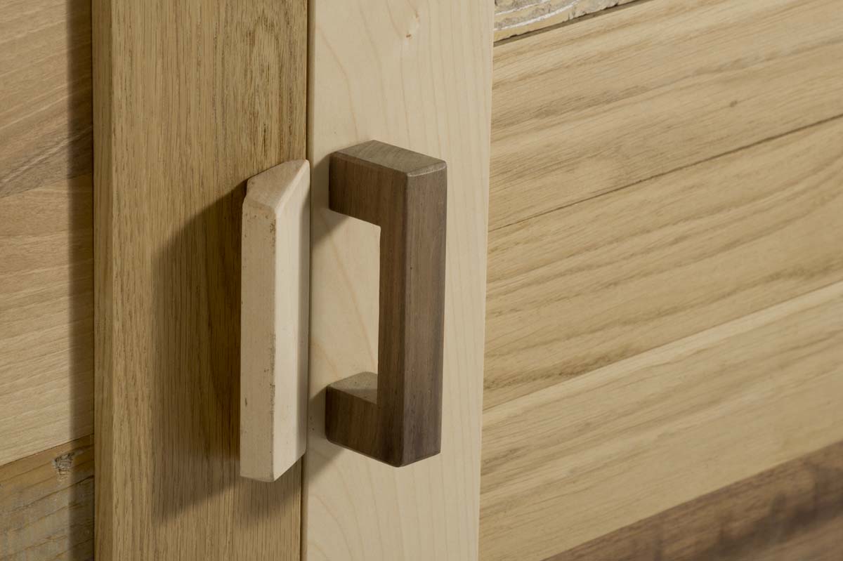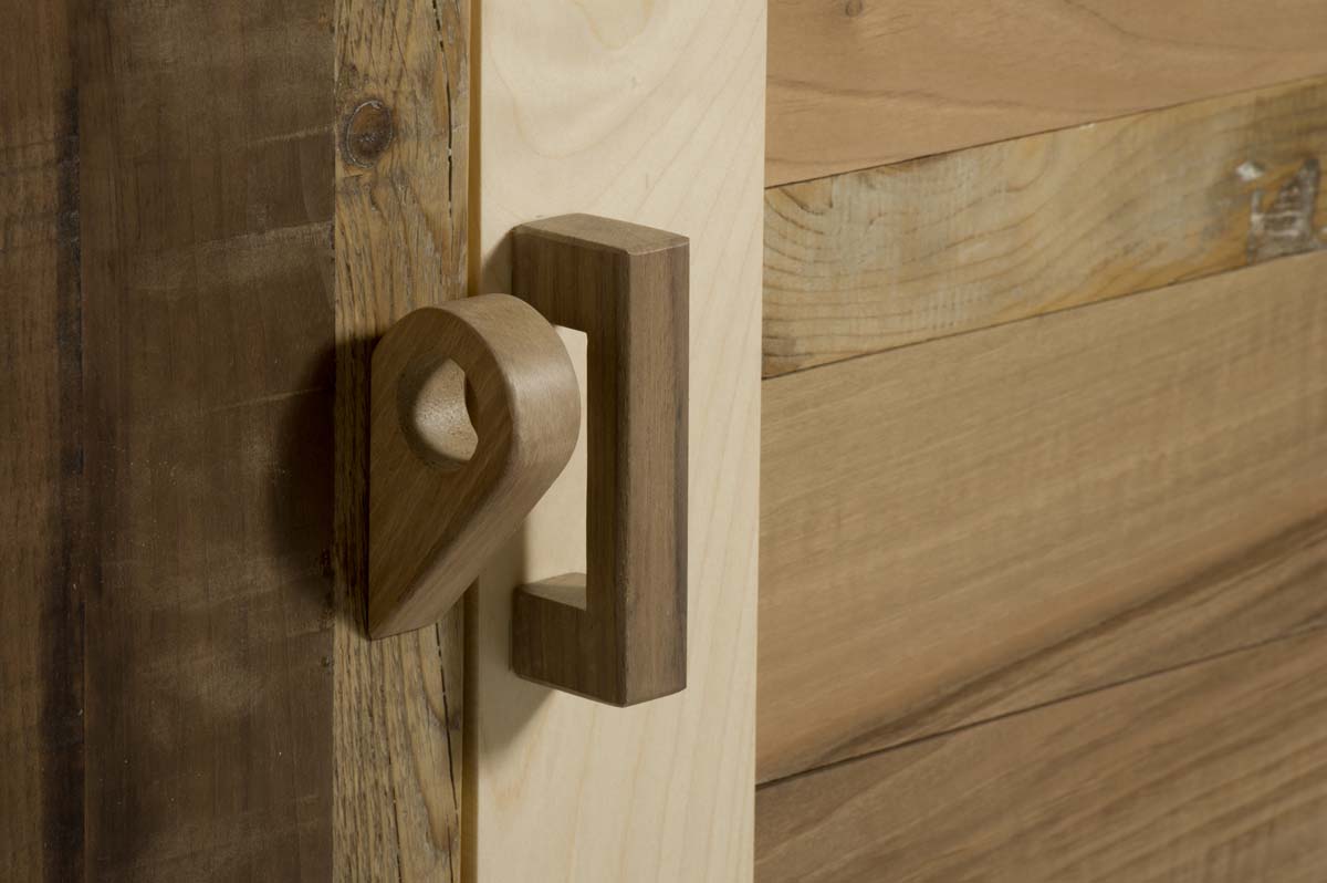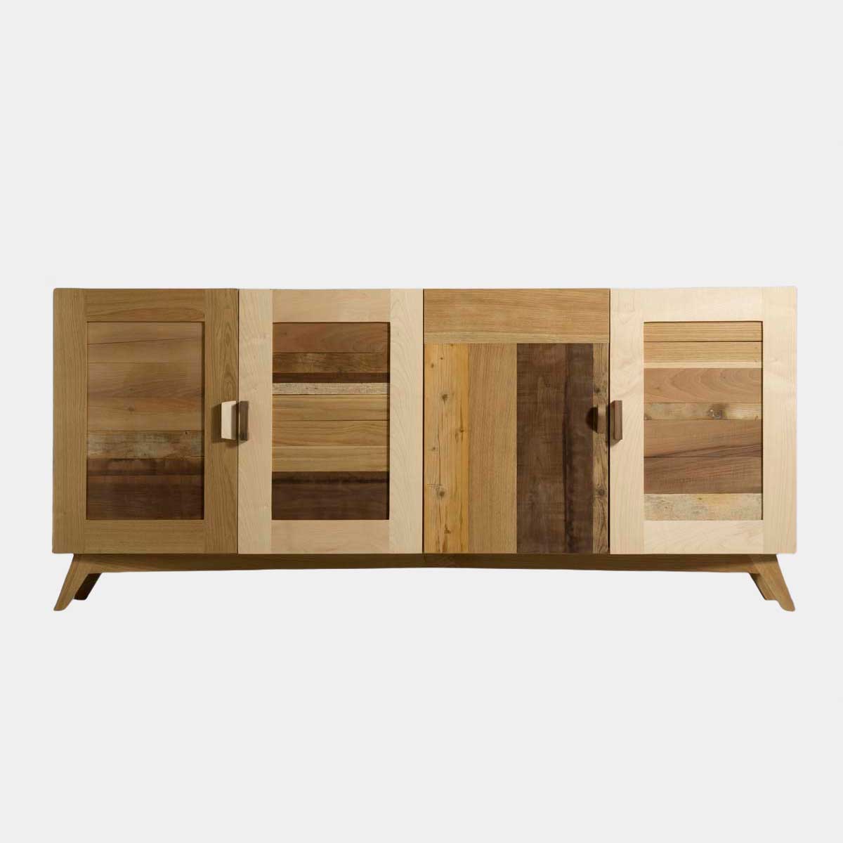La struttura del mobile, in rovere massello, è suddiviso simmetricamente in 2 grandi vani, chiusi entrambi da 2 ante. All’interno di ogni vano c’è un ripiano mediano. Le ante sono realizzate in legno massello di varie essenze e prevedono un gioco di assi orizzontali e verticali, alternando legno nuovo e legno di recupero. Le maniglie, tutte diverse, sono realizzate a mano. Le gambe, rastremate e inclinate, sono in rovere massello.
