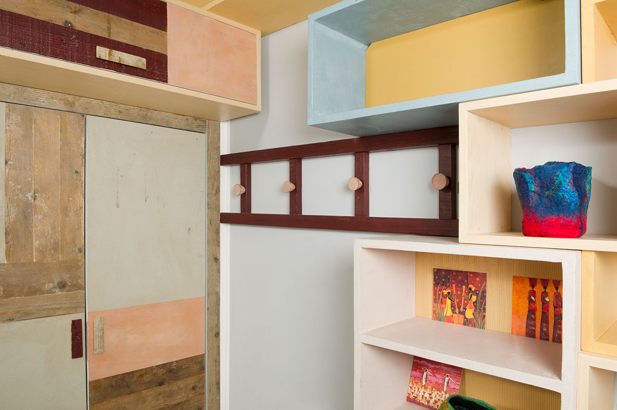Una parete attrezzata ad angolo come “Pane e Rose”, per esempio, utilizza moduli sovrapposti e ancorati solidamente al muro, che si sviluppano lungo l’angolo della stanza per sfruttare al meglio lo spazio. Questi moduli possono includere elementi unici come cassettiere, vani a giorno e spazi chiusi, offrendo un’ampia varietà di soluzioni per riporre oggetti e accessori in modo ordinato. L’aggiunta di elementi particolari come una scala a pioli trasformata in appendiabiti, come nel caso di questo modello, rende la parete attrezzata ad angolo non solo funzionale ma anche esteticamente originale.