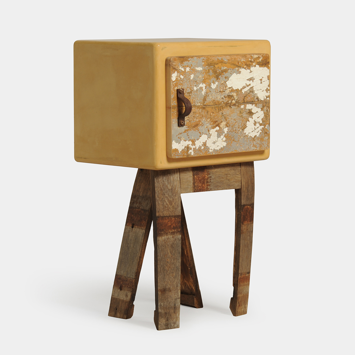 piccolo mobile contenitore della collezione “Pupazzi”, che abbina una laccatura materica giallo ocra a elementi in legno di recupero. Ideale come comodino o mobiletto di servizio.