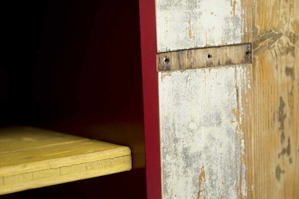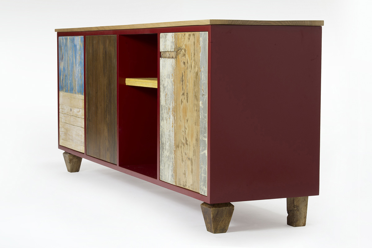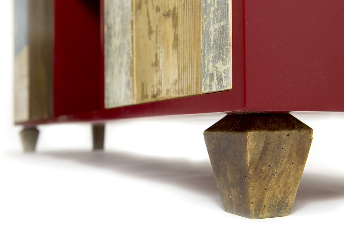 Il mobile, laccato in un elegante rosso bordò opaco, aggiunge un tocco di colore che può diventare un punto focale nell’arredamento del soggiorno. Le ante e i piedi, realizzati in legno massello di noce alternato a legno di recupero colorato, conferiscono al mobile un aspetto unico, mescolando modernità e tradizione. Inoltre, su richiesta, è possibile aggiungere asole e fori passacavi per un collegamento ordinato e discreto di tutti i cavi necessari.