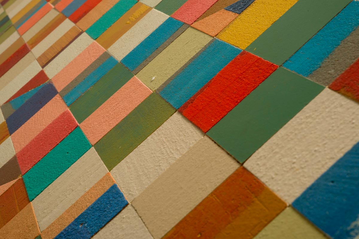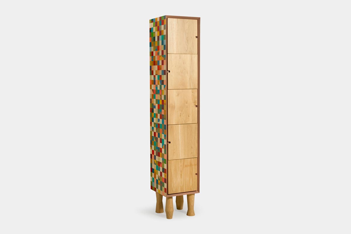 La struttura della credenza è in legno multistrato, rivestimento con mosaico di tessere di legno decorate con microcemento colorato.