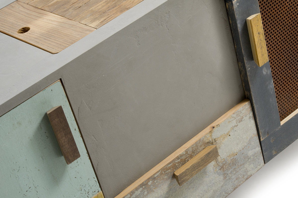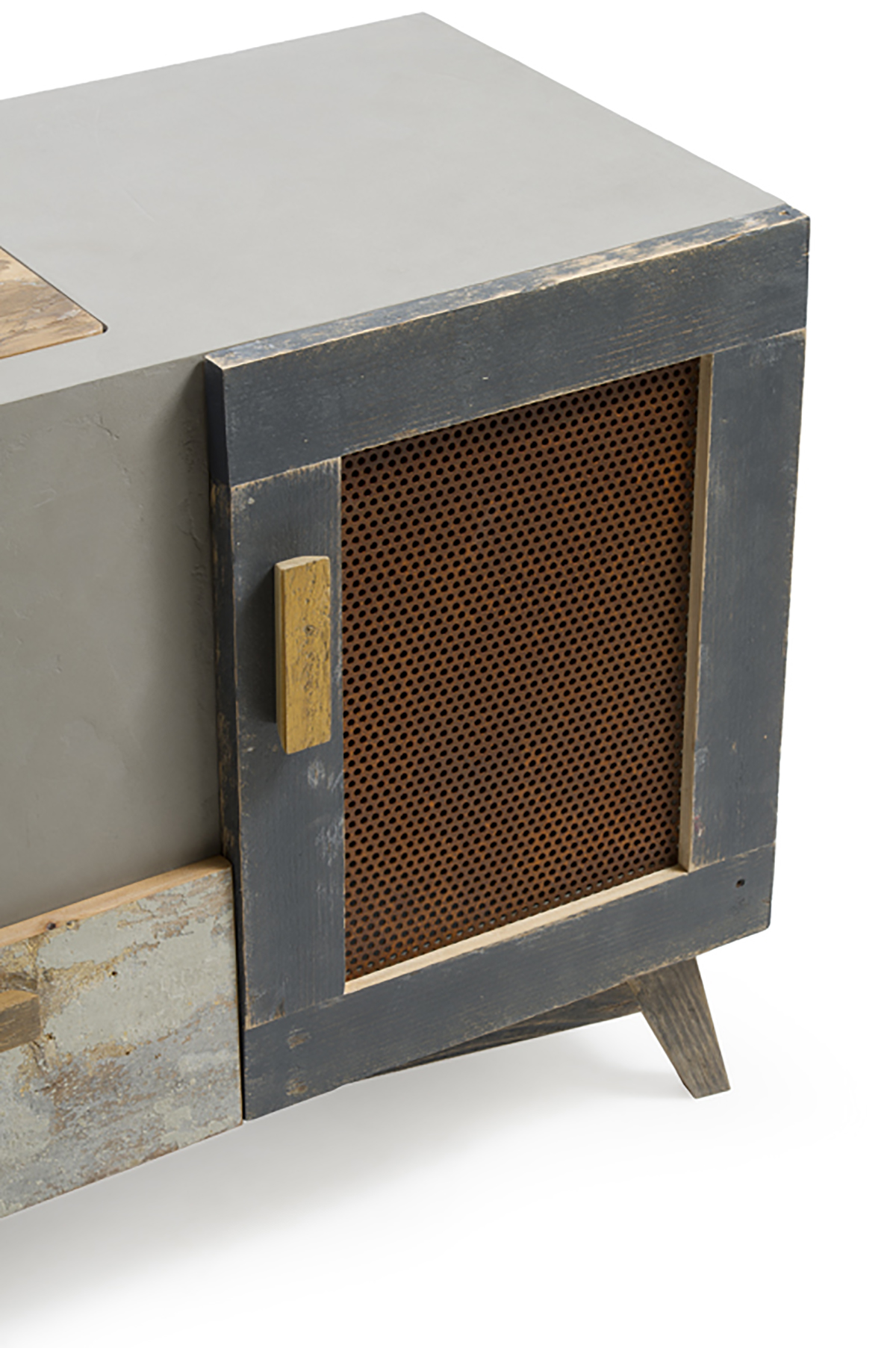 Rischiara è un mobile TV legno grezzo dall’estetica vintage ma dai materiali innovativi, come il microcemento usato per il rivestimento della struttura e l’uso del legno di recupero. La credenza Rischiara è perfetta come mobile per living e soggiorni, pensata come solida base di appoggio per Tv, anche di grosse dimensioni.