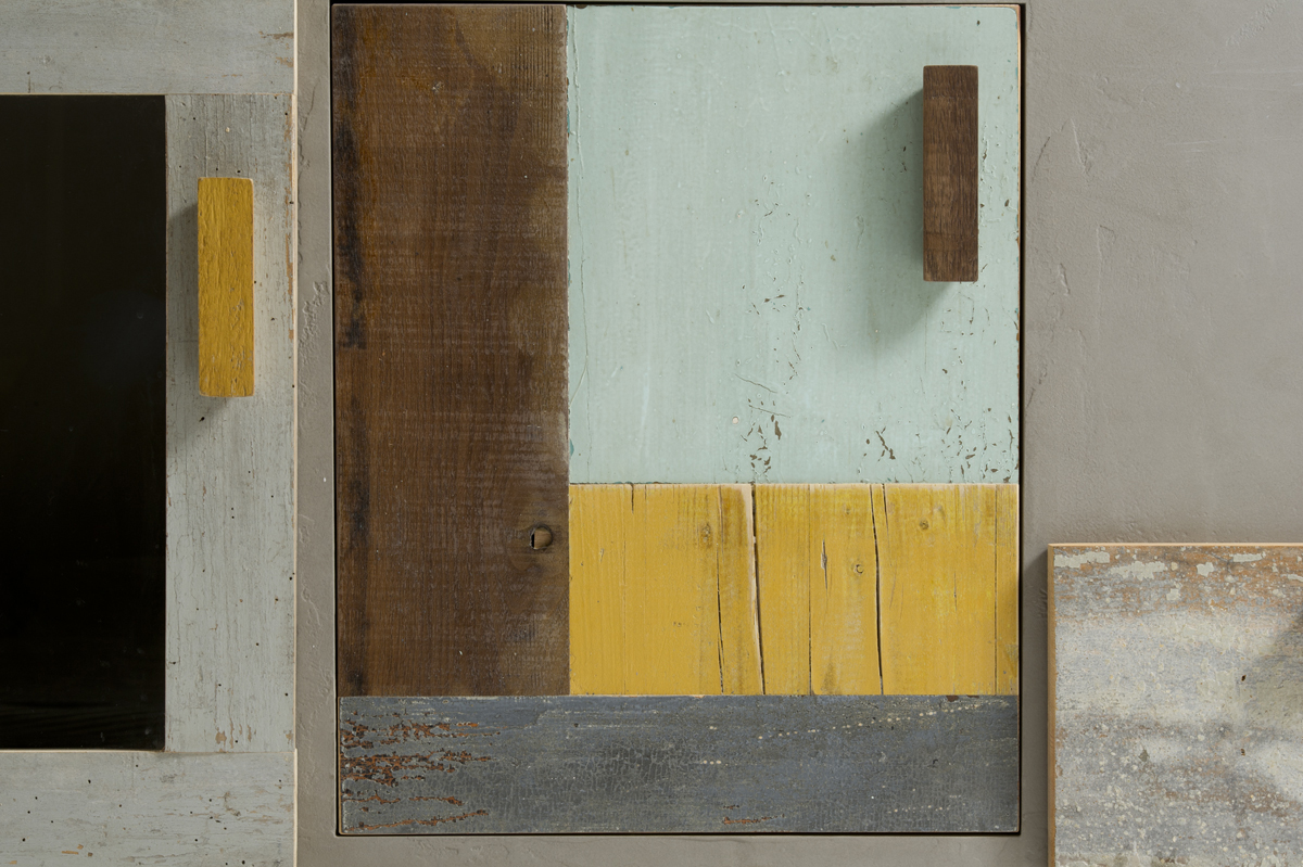 -legno massello di recupero -legno multistrato -microcemento -vetro -lamiera forata di ferro