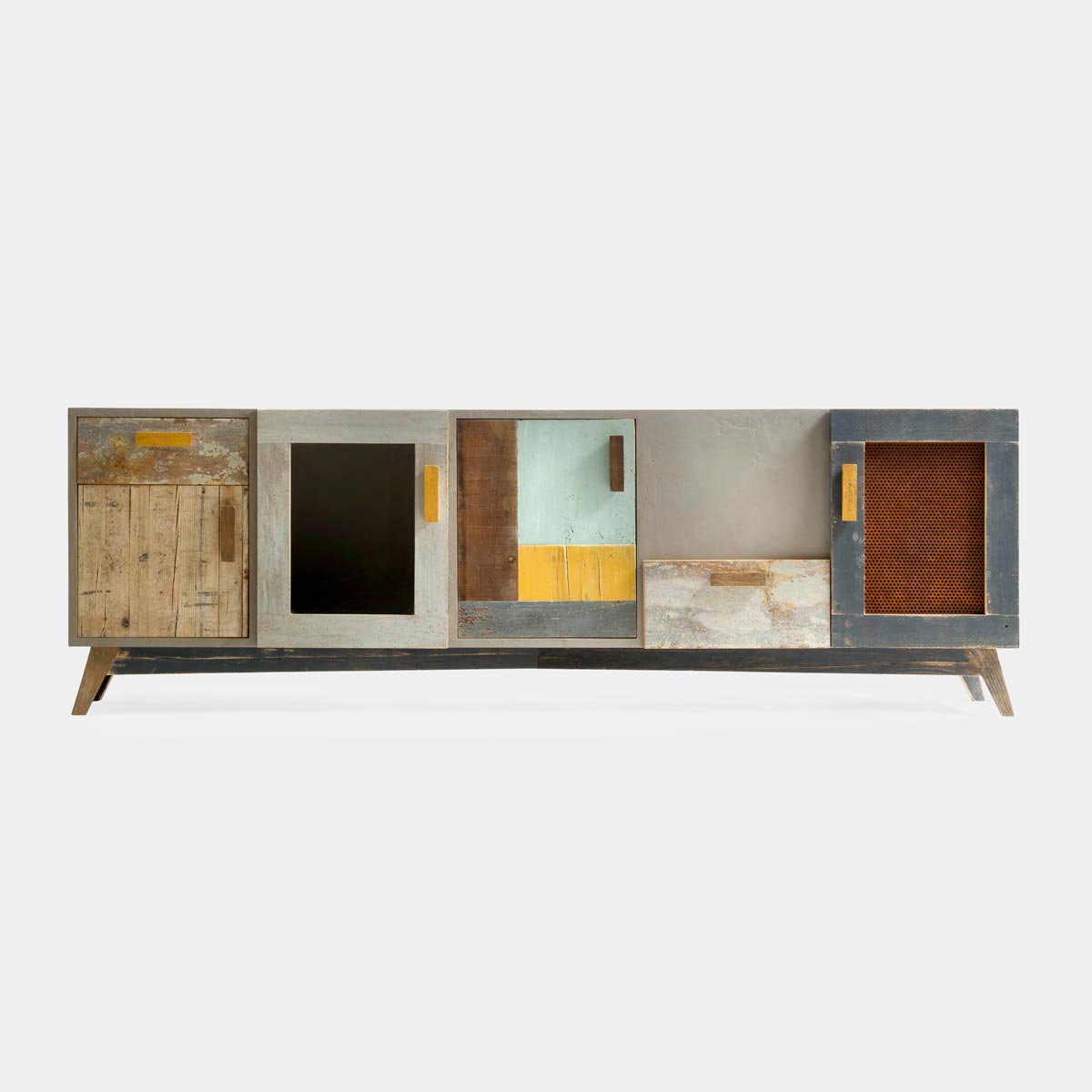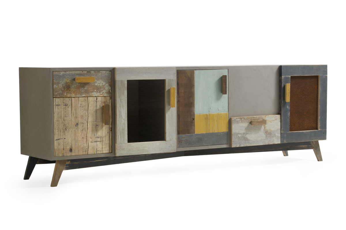 La credenza  prevede 4 vani chiusi da ante, un cassetto e (opzionale) una botola sul top per alloggiare bottiglie e oggetti alti. Una delle ante è vetrata (vetro fumè) e un’altra è chiusa con lamiera forata di ferro ossidata. Tutti i frontali del mobile , così come le gambe, sono realizzati in legno di recupero proveniente da vecchi mobili, infissi e solai.