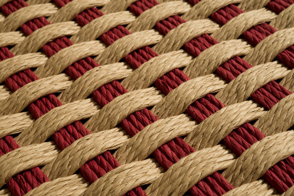 Esistono due esemplari di questa sedia con corda intrecciata. Questa è la nº1: color corda e bordeaux.