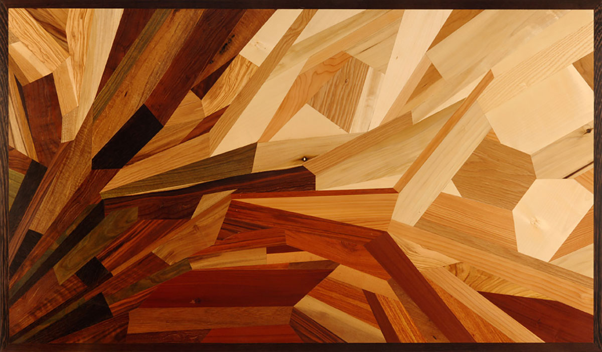 La particolarità del tavolo LuceOmbra risiede nel suo piano, che è realizzato con una spettacolare tarsia a mosaico composta da diverse essenze di legno massello. Ogni frammento del mosaico è un poligono irregolare, perfettamente incastrato con gli altri, per creare un disegno complesso e unico. Questo mosaico di schegge di legno è pensato per generare un effetto visivo straordinario, in cui i toni scuri delle essenze come wengé, noce e castagno antico sfumano gradualmente verso colori chiari come quelli del ciliegio e dell’acero. Grazie a questa lavorazione, il tavolo diventa un vero e proprio pezzo d’arte, che valorizza il fascino naturale del legno.
