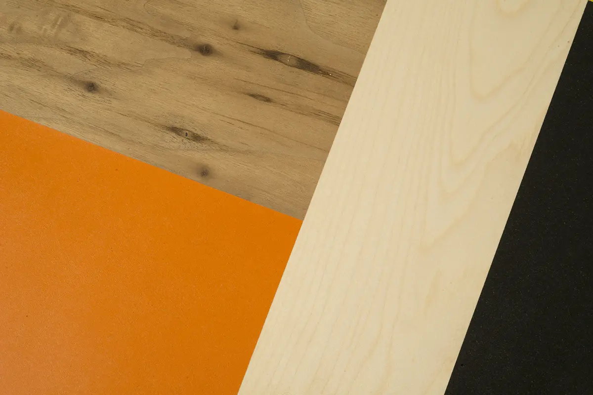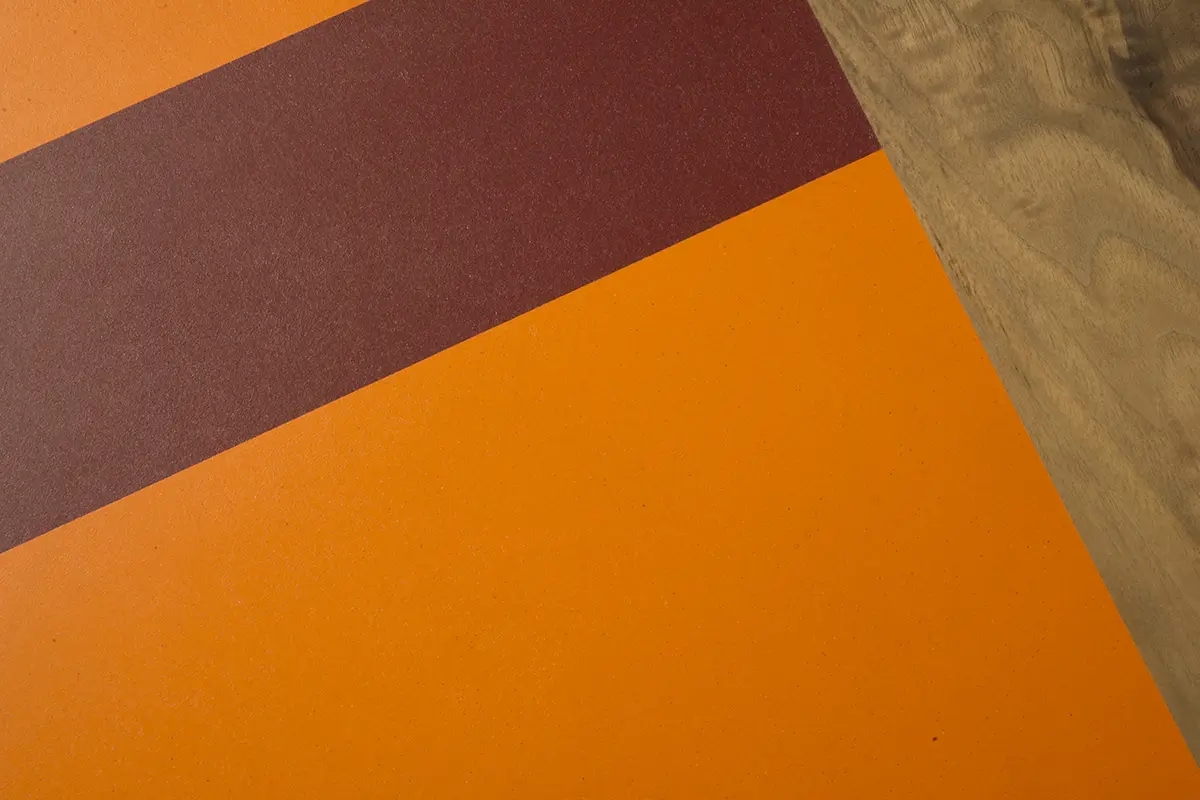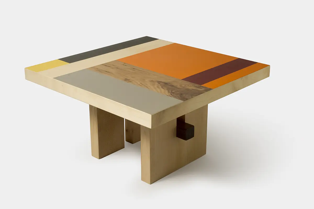 Il piano del tavolino basso quadrato è realizzato con un patchwork di materiali pregiati come acero, noce e linoleum colorato, creando un gioco di texture e tonalità che lo rende unico nel suo genere. Il linoleum utilizzato è completamente naturale, composto da olio di lino, fibra di legno e juta, prodotto in Umbria, una regione rinomata per la sua tradizione artigianale.