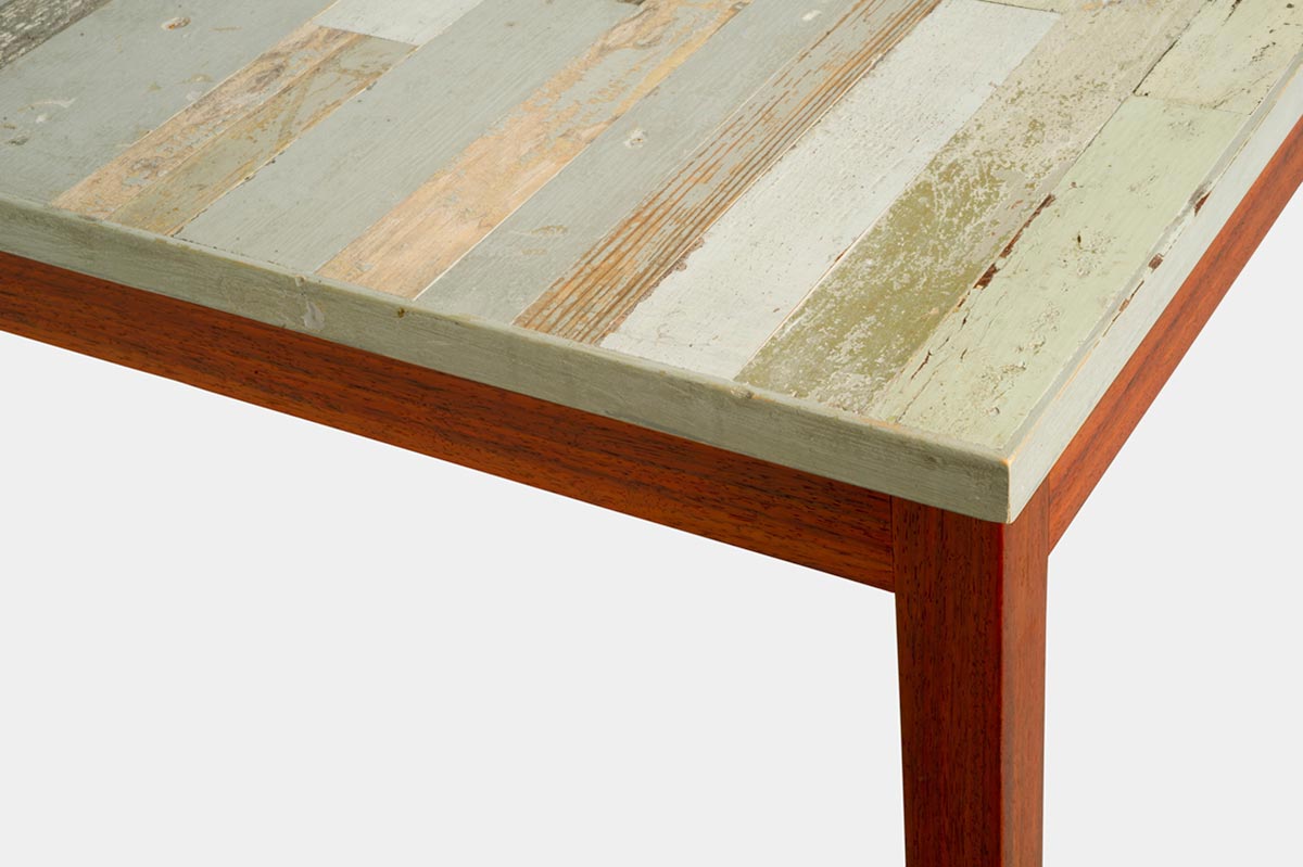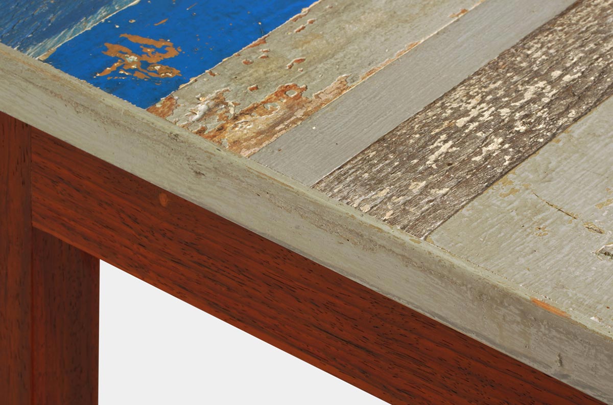 • Top del tavolo realizzato con un mix di pezzi di legno di recupero, di varia natura, colore e epoca assemblatati a mano con un puzzle.